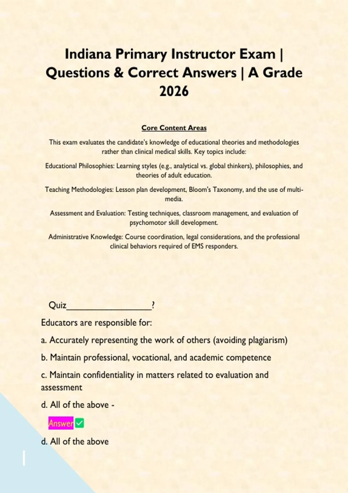 1 Exam (elaborations) Indiana Primary Instructor Exam | Questions & Correct Answers | A Grade 2 Exam (elaborations) Primary Instructor Final Exam | Questions & Correct Answers | A Grade