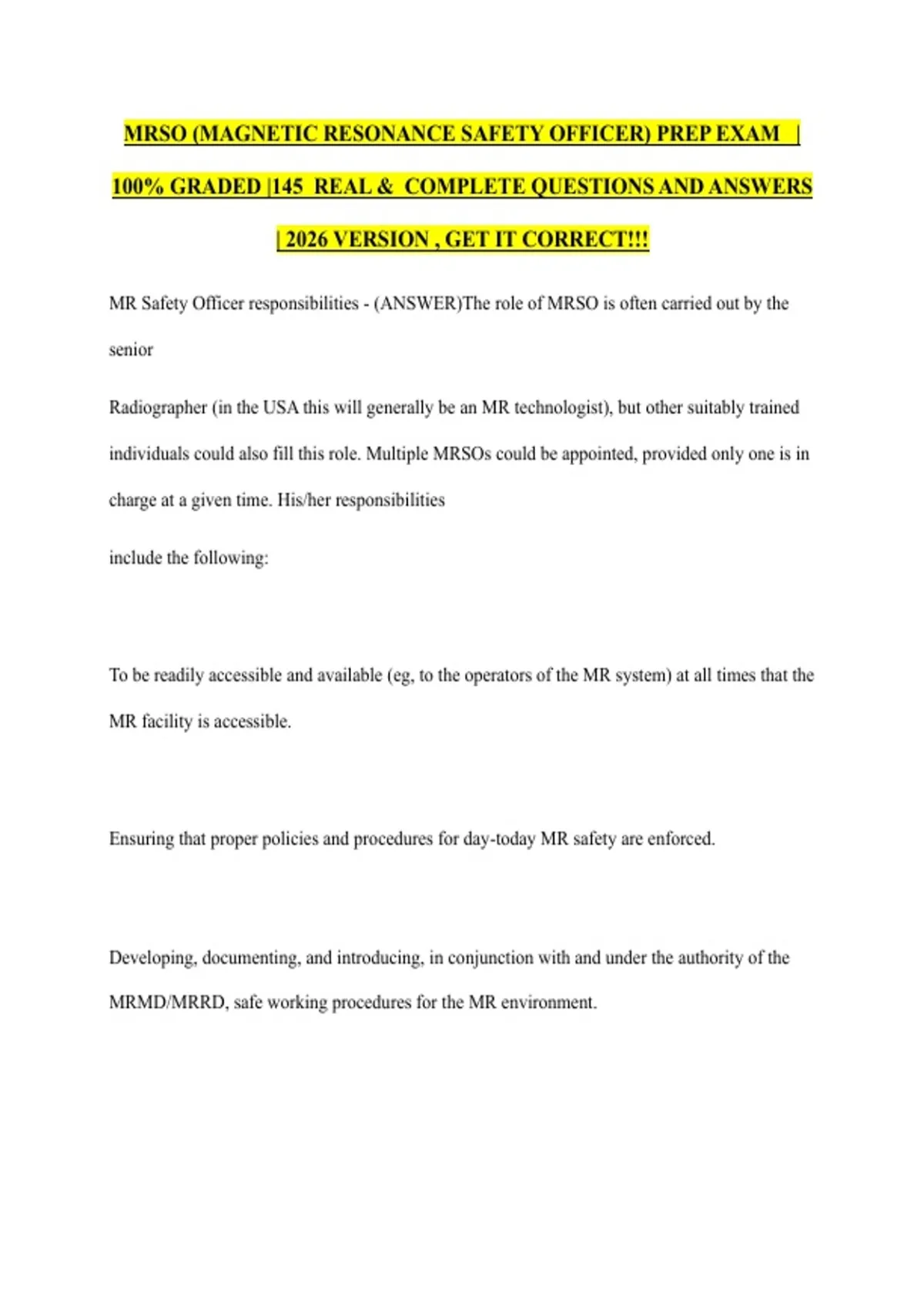 PACKAGE DEAL FOR MRSO (MAGNETIC RESONANCE SAFETY OFFICER) EXAMS | 100% GRADED | REAL & COMPLETE QUESTIONS AND ANSWERS | 2026 VERSION , GET IT CORRECT!!!