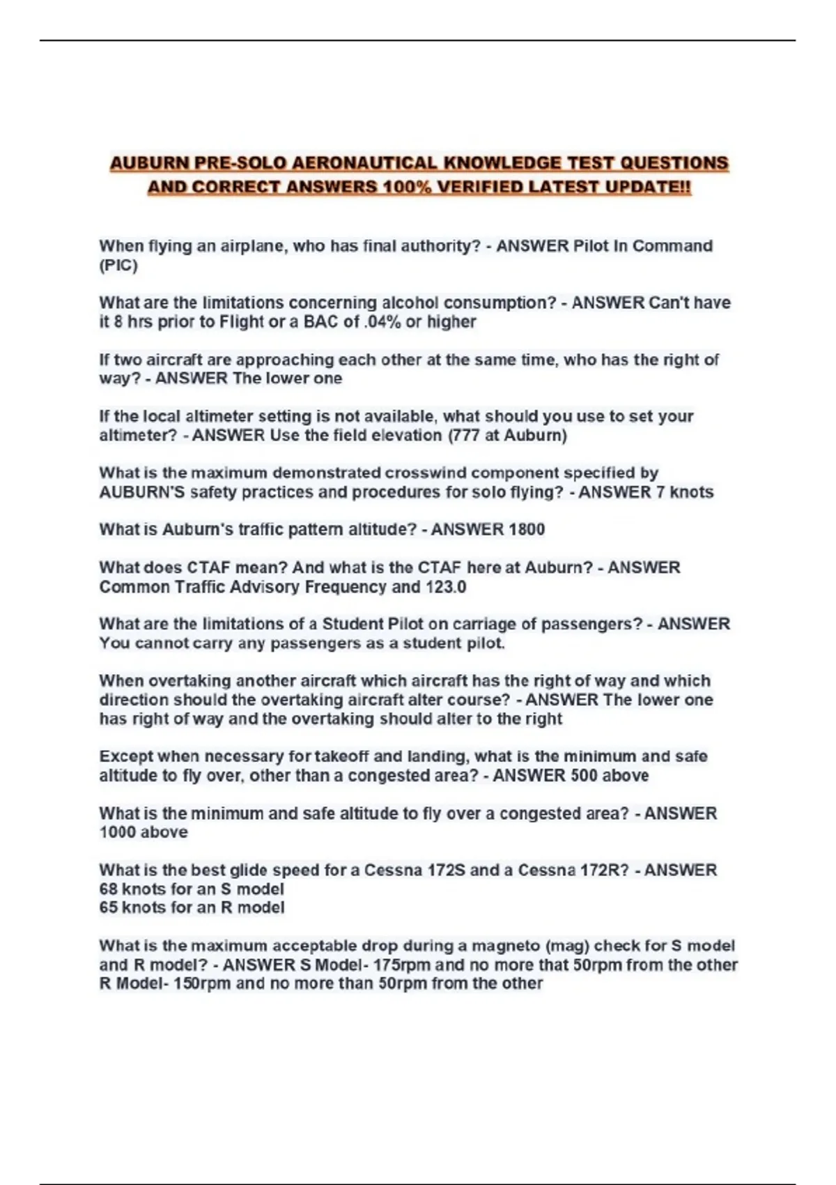 AUBURN PRE-SOLO AERONAUTICAL KNOWLEDGE TEST QUESTIONS AND CORRECT ANSWERS 100% VERIFIED LATEST UPDATE!!