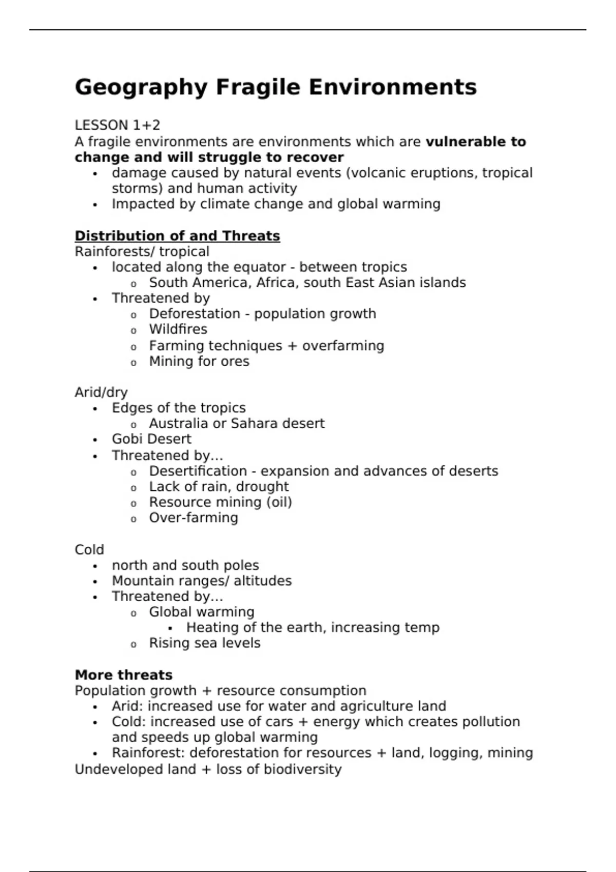 Summary Notes for geography fragile environments iGCSE Pearson Edexcel