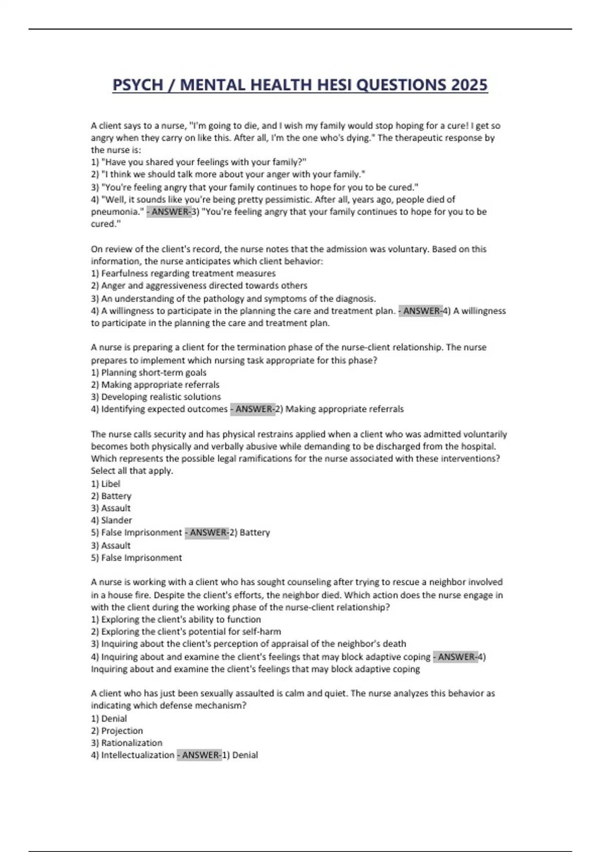 PSYCH / MENTAL HEALTH HESI QUESTIONS 2025