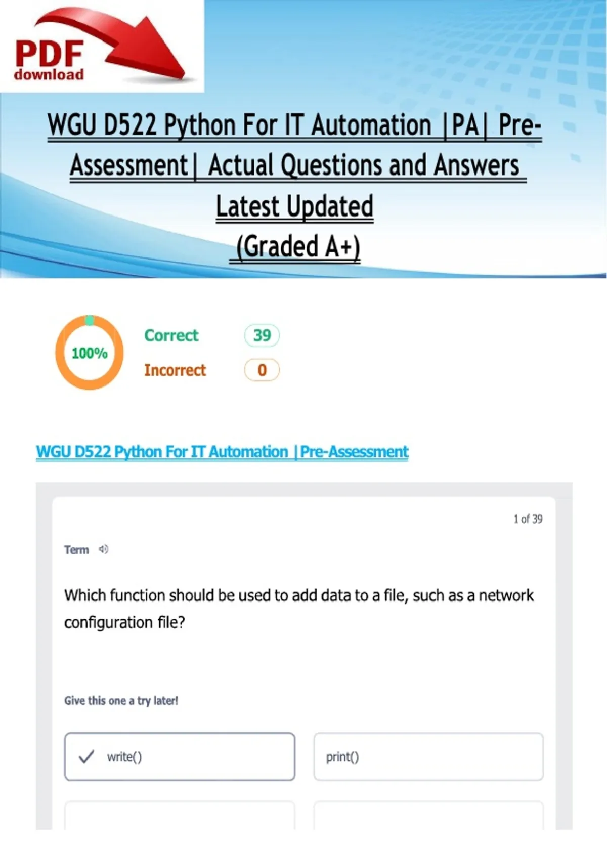 WGU D522 Python For IT Automation |OA| Objective Assessment| Actual Questions and Answers Latest Updated 2026/2027 (Graded A+) WGU D522 Python For IT Automation |PA| Pre-Assessment| Actual Questions and Answers Latest Updated 2026/2027 (Graded A+)