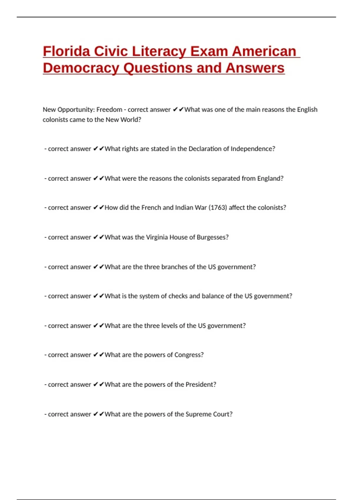 Florida Civic Literacy Exam American Democracy Questions and Answers
