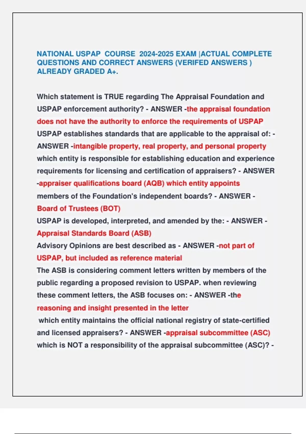 National USPAP Course Exam || Most Recent Exam Actual Complete Real Exam Questions And Correct Answers (Verified Answers) Already Graded A+ | Guaranteed Success | Newest Exam | Just Released!! NATIONAL USPAP COURSE EXAM |ACTUAL COMPLETE QUESTIONS AND CORRECT ANSWERS (VERIFED ANSWERS ) ALREADY GRADED A+.