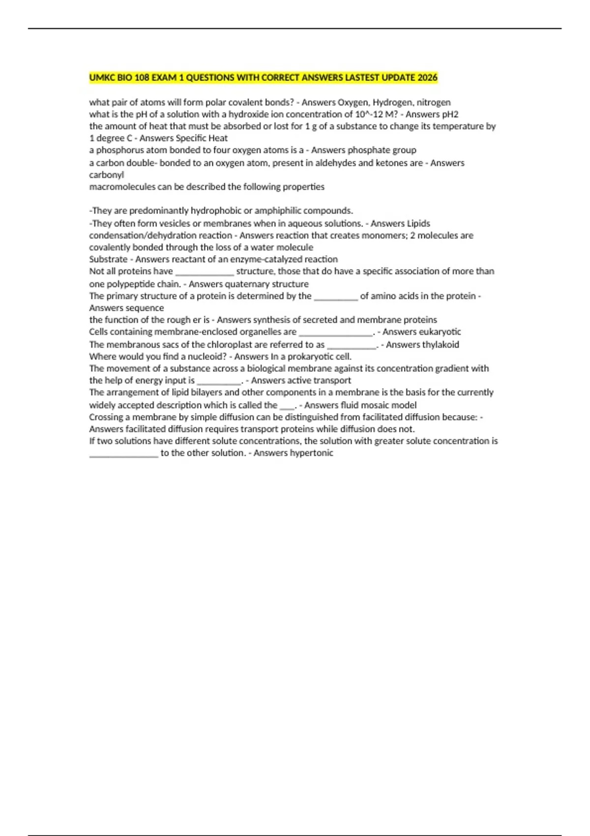 UMKC BIO 108 EXAM 1 QUESTIONS WITH CORRECT ANSWERS LASTEST UPDATE 2026
