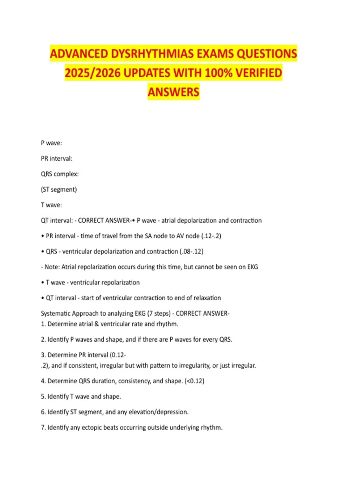 Master EKG interpretation with this 5-document 2026 update bundle. Includes verified questions and answers for Relias Basic & Advanced Dysrhythmia assessments. Covers sinus rhythms, complex heart blocks, pacemaker troubleshooting, ACLS protocols, and 12-lead analysis. The essential all-in-one package for nursing students and clinical professionals.