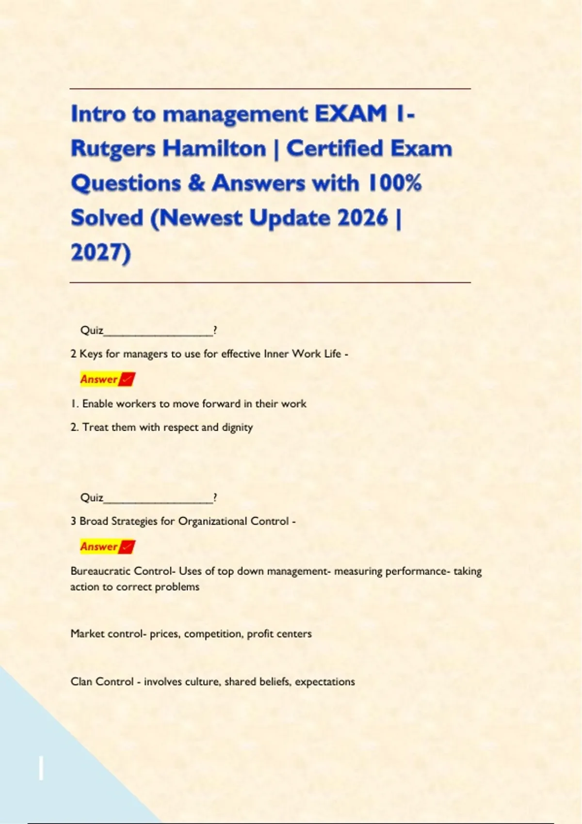 Intro to Management Exam 1 - Hamilton, Rutgers | Test Review Exam Questions & Verified Answers, 2026 | 2027. 2 Exam (elaborations) Intro to management EXAM 1- Rutgers Hamilton | Certified Exam Questions & Answers with 100% Solved (Newest Update 2026 | 2027) 3 Exam (elaborations) Rutgers Intro to Management Exam #2 | Comprehensive Practice Test Re