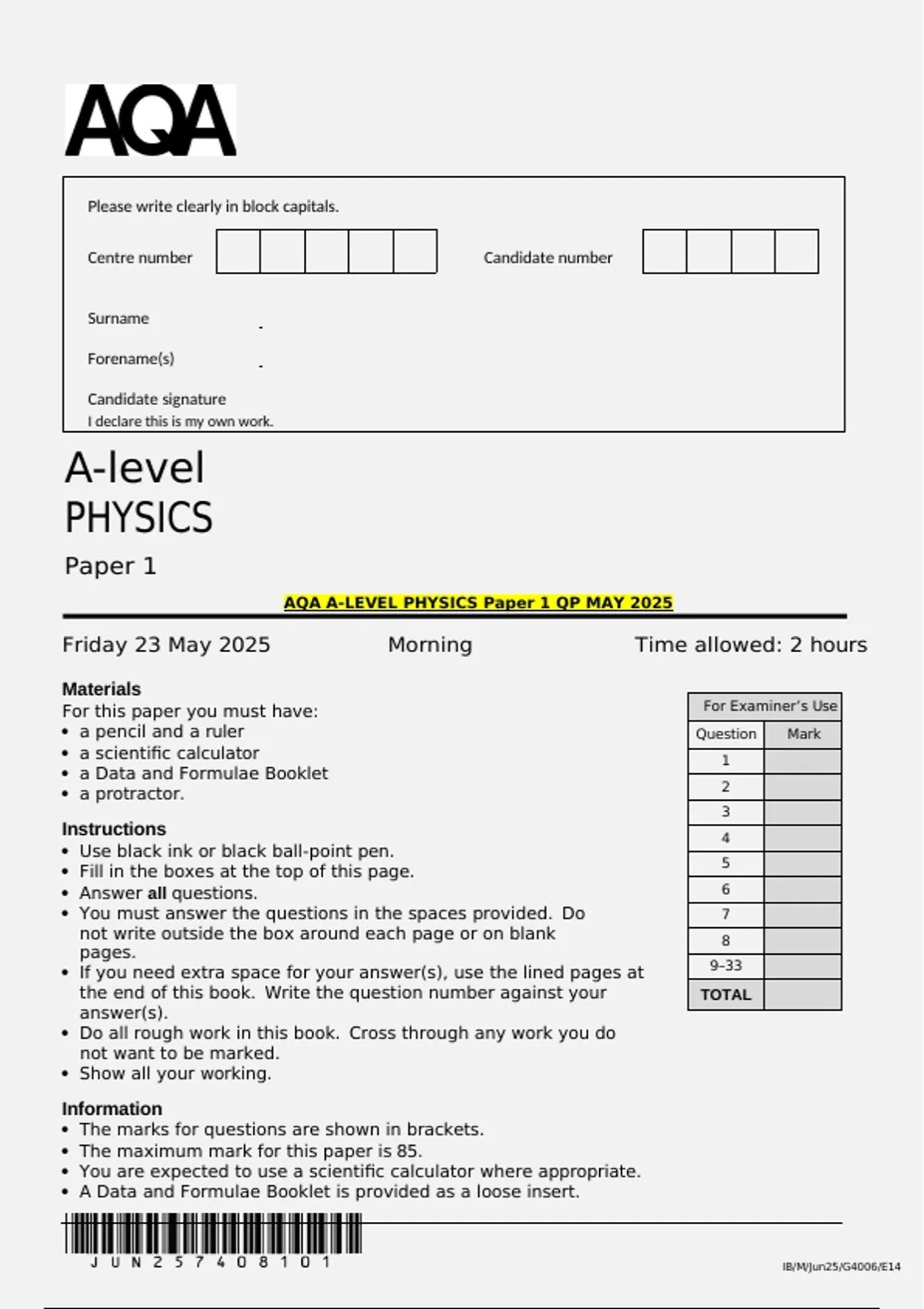 AQA A-LEVEL PHYSICS Paper 1 QP MAY 2025