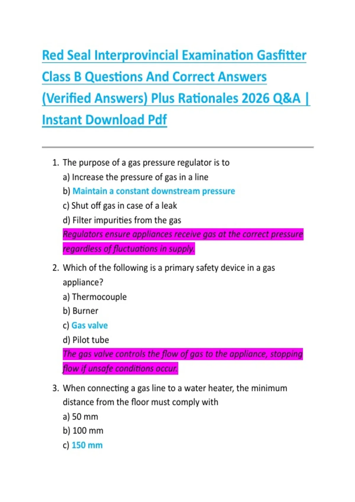Bundle for Red Seal Interprovincial Examination Gasfitter Class A and B Questions And Correct Answers (Verified Answers) Plus Rationales 2026 Q&A | Instant Download Pdf