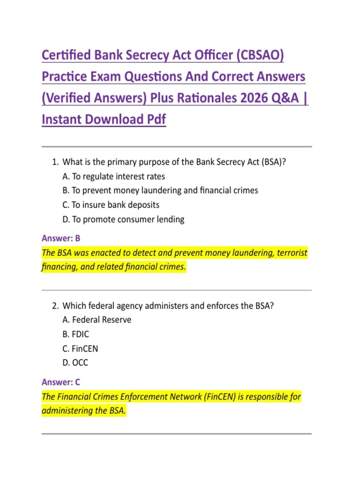 Bundle for Certified Bank Secrecy Act Officer (CBSAO) Practice Exam Questions And Correct Answers (Verified Answers) Plus Rationales 2026 Q&A | Instant Download Pdf