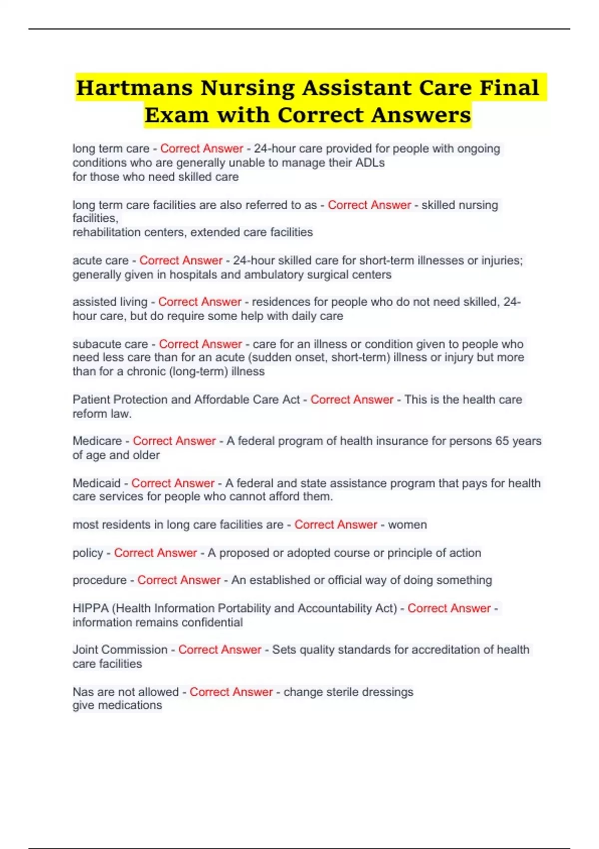 Instructor’s Guide & Test Banks Exams NURSING ASSISTANT CARE Questions with correct verified detailed answers latest update