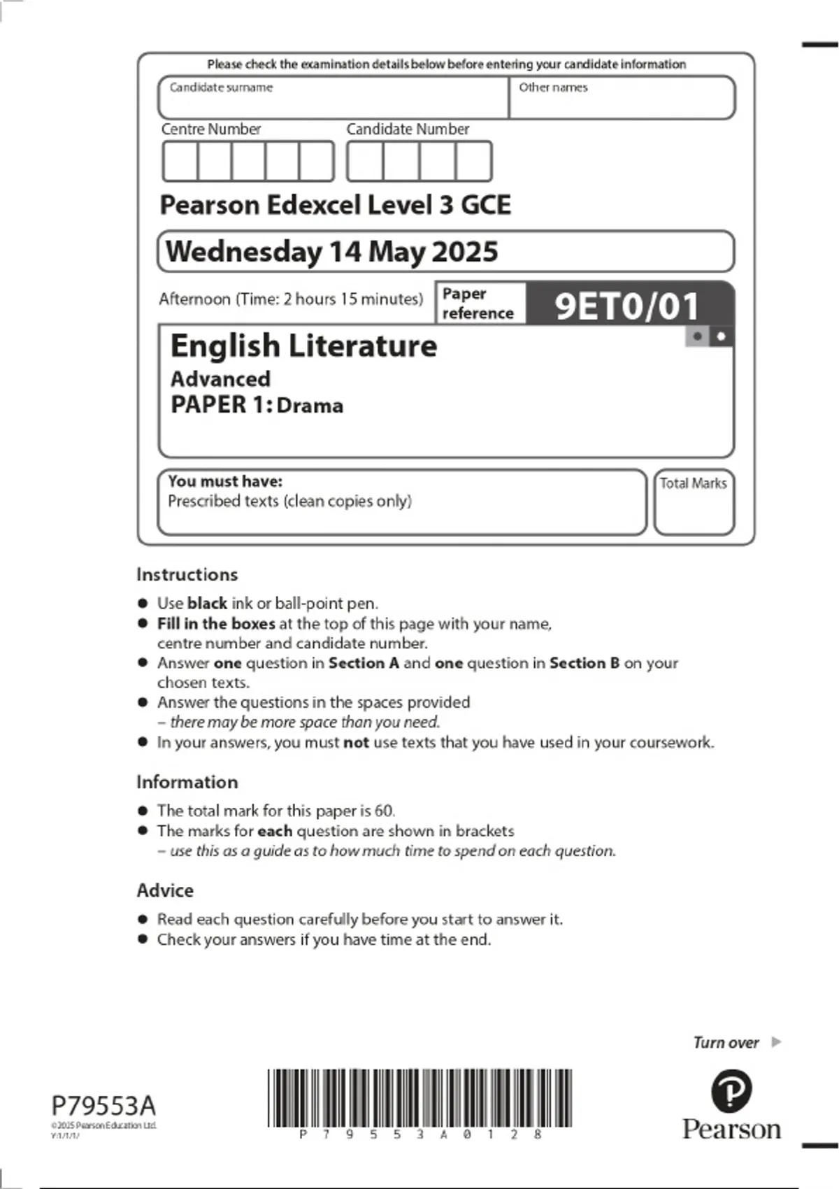 2025 Pearson Edexcel Level 3 GCE Thursday 22 May 2025 English Literature Advanced PAPER 2: Prose Combined Question Paper & Marking Scheme 3 Exam (elaborations) 2025 Pearson Edexcel Level 3 GCE Wednesday 11 June 2025 English Literature Advanced PAPER 3: Poetry Combined Question Paper & Marking Scheme 4 Exam (elaborations) 2025 Pearson Edexcel Leve