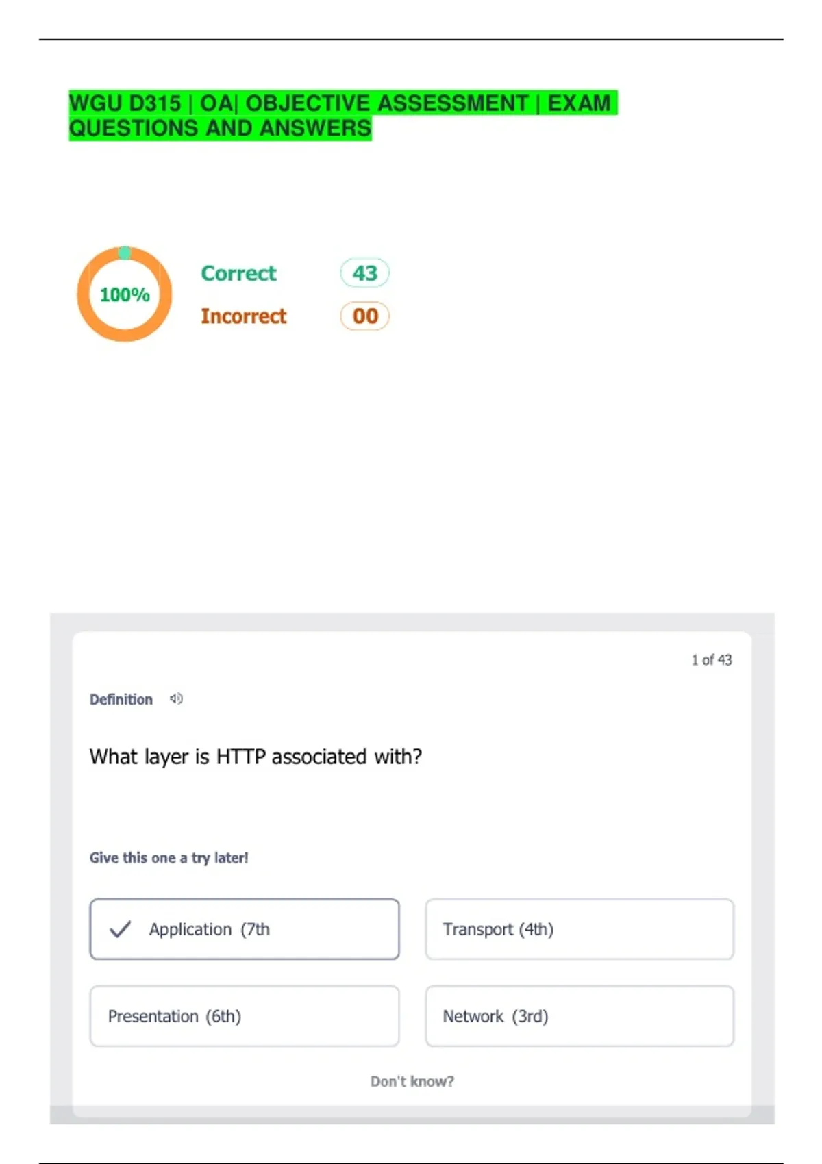 1 Exam (elaborations) WGU D315|PA|PRE-ASSESSMENT| EXAM QUESTIONS AND ANSWERS| LATEST UPDATE 2 Exam (elaborations) WGU D315| PA| PRE-ASSESSMENT| NETWORK AND SECURITY - FOUNDATIONS OSI| EXAM QUESTIONS WITH CORRECT ANSWERS 3 Exam (elaborations) WGU D315| OA| OBJECTIVE ASSESSMENT| EXAM QUESTIONS AND ANSWERS| LATEST UPDATE | FULLY SOLVED 4 Exam (elab