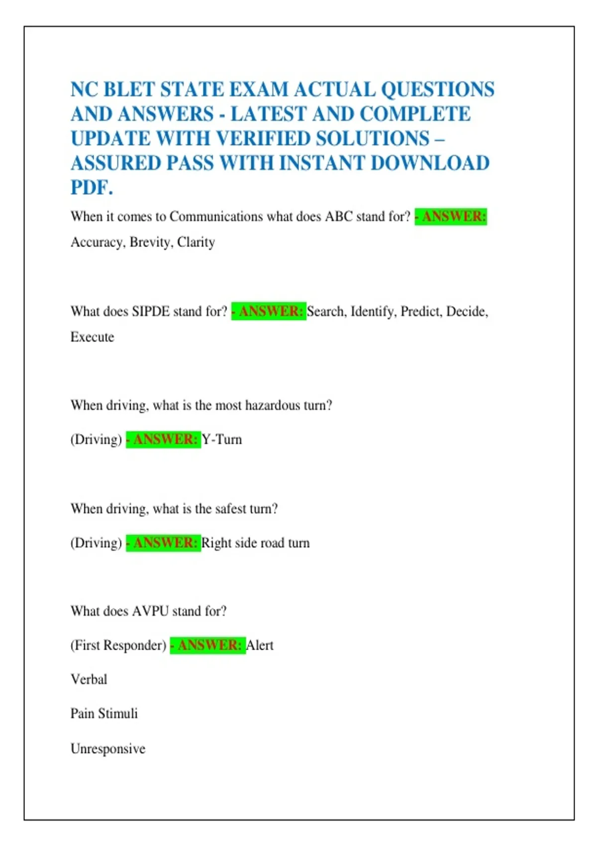 NC BLET STATE EXAMs package ACTUAL QUESTIONS AND ANSWERS - LATEST AND COMPLETE UPDATE WITH VERIFIED SOLUTIONS – ASSURED PASS WITH INSTANT DOWNLOAD PDF.