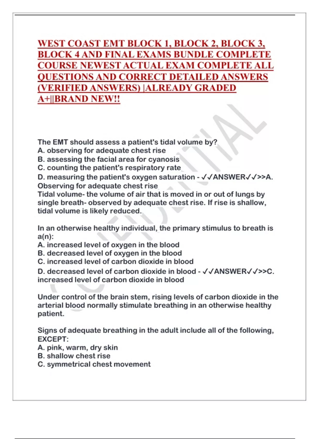 WEST COAST EMT BLOCK 1, BLOCK 2, BLOCK 3, BLOCK 4 AND FINAL EXAMS BUNDLE COMPLETE COURSE NEWEST ACTUAL EXAM COMPLETE ALL QUESTIONS AND CORRECT DETAILED ANSWERS (VERIFIED ANSWERS) |ALREADY GRADED A+||BRAND NEW!!