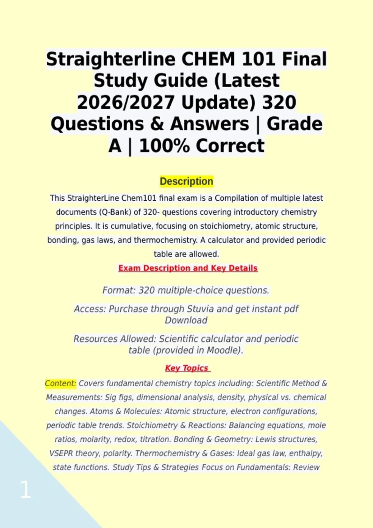 1 Exam (elaborations) Straighterline CHEM 101 Final Study Guide (Latest 2026/2027 Update) Questions & Answers | Grade A | 100% Correct 2 Exam (elaborations) Straighterline CHEM 101 Final Study Guide (Latest 2026/2027 Update) 320 Questions & Answers | Grade A | 100% Correct Description This StraighterLine Chem101 final exam is a Compilation of mult