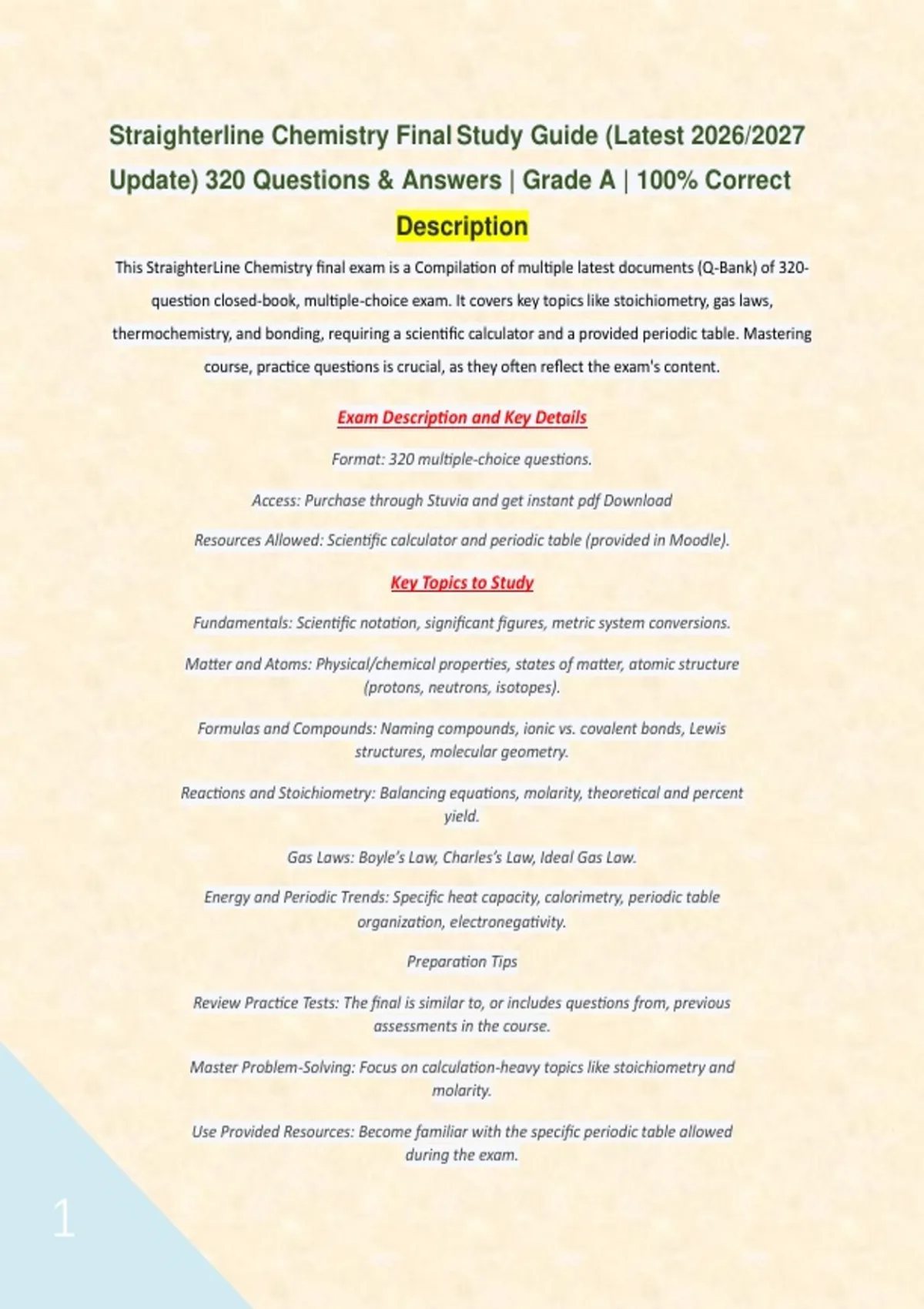 1 Exam (elaborations) Straighterline CHEM 101 Final Study Guide (Latest 2026/2027 Update) 320 Questions & Answers | Grade A | 100% Correct Description This StraighterLine Chem101 final exam is a Compilation of multiple latest documents (Q-Bank) of 320- questions covering intr 2 Exam (elaborations) Straighterline Chemistry Final Study Guide (Latest