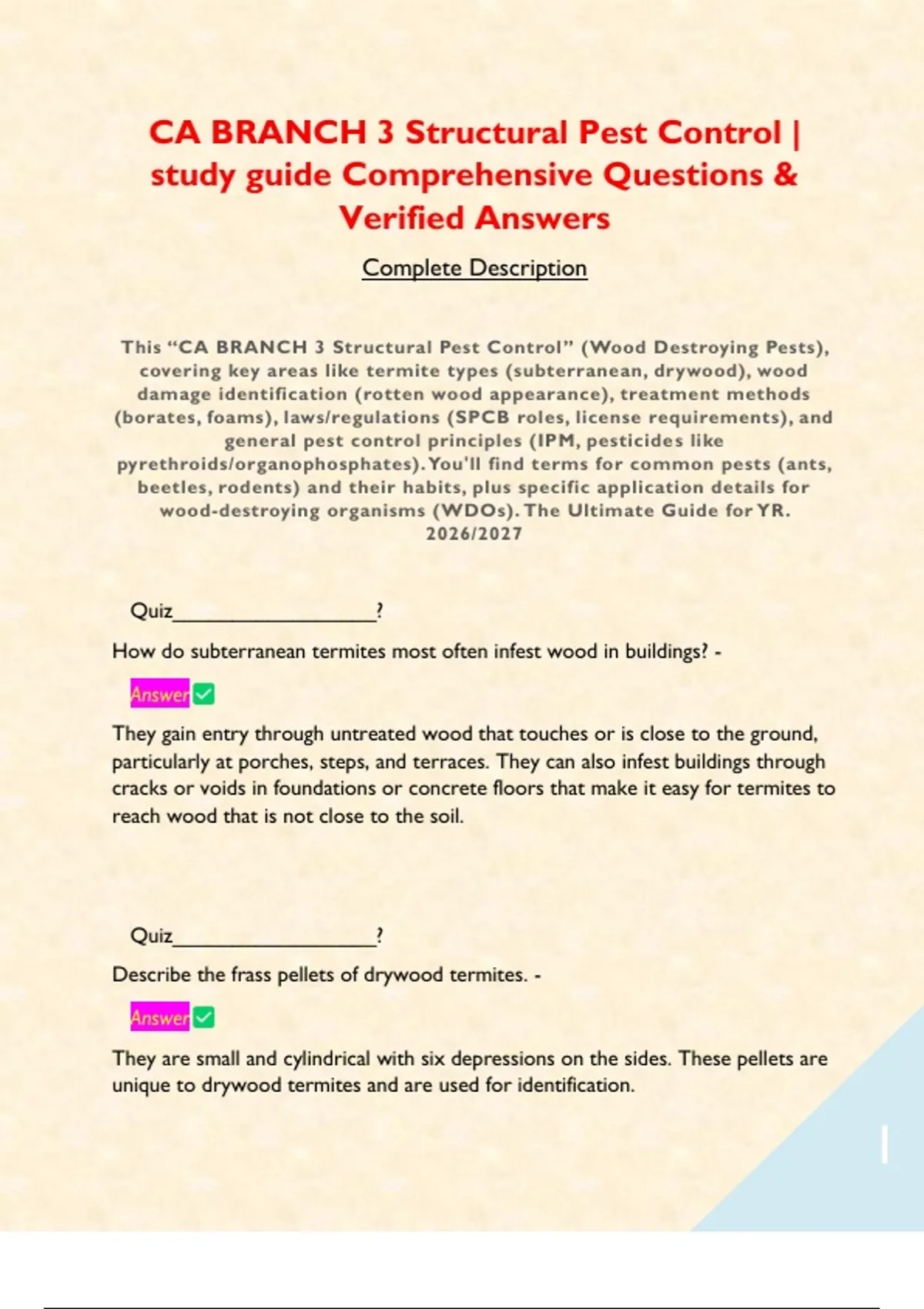 1 Exam (elaborations) CA Branch 2 Field Rep Study Guide (Latest 2026/2027 Update) 110+ Questions & Answers | Grade A | 100% Correct 2 Exam (elaborations) CA BRANCH 3 Structural Pest Control | study guide Comprehensive Questions & Verified Answers Complete Description