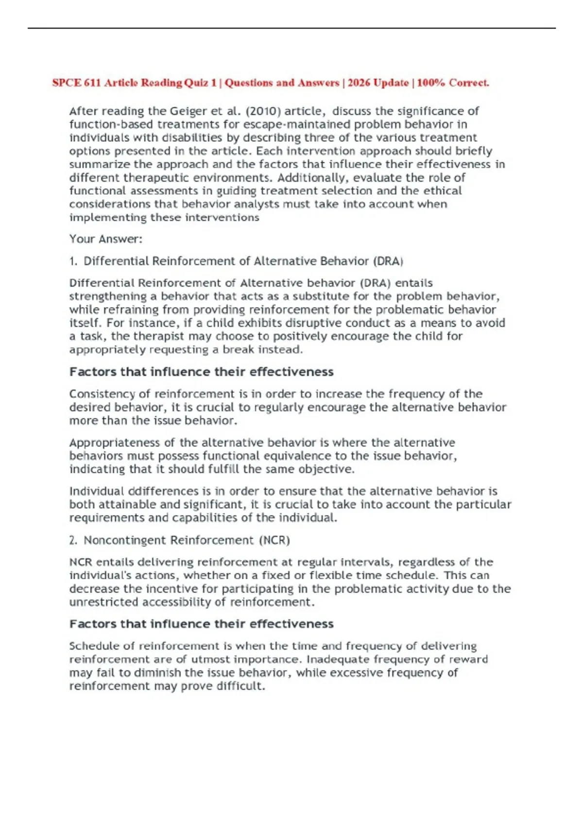 SPCE 611 Comprehensive Final Exam | Questions and Answers SPCE 611 EXAM 6 (modules 13-15) SPCE 611 EXAM 4 (mods 8-10) SPCE 611 Exam 3 SPCE 611 Exam 1 SPCE 611 Reading Quiz 4 SPCE 611 Reading Quiz 3 SPCE 611 Learning Activity 2 Punishment Use & Considerations SPCE 611 Reading Quiz 2 SPCE 611 Reading Quiz 1 SPCE 611 Article Reading Quiz 1