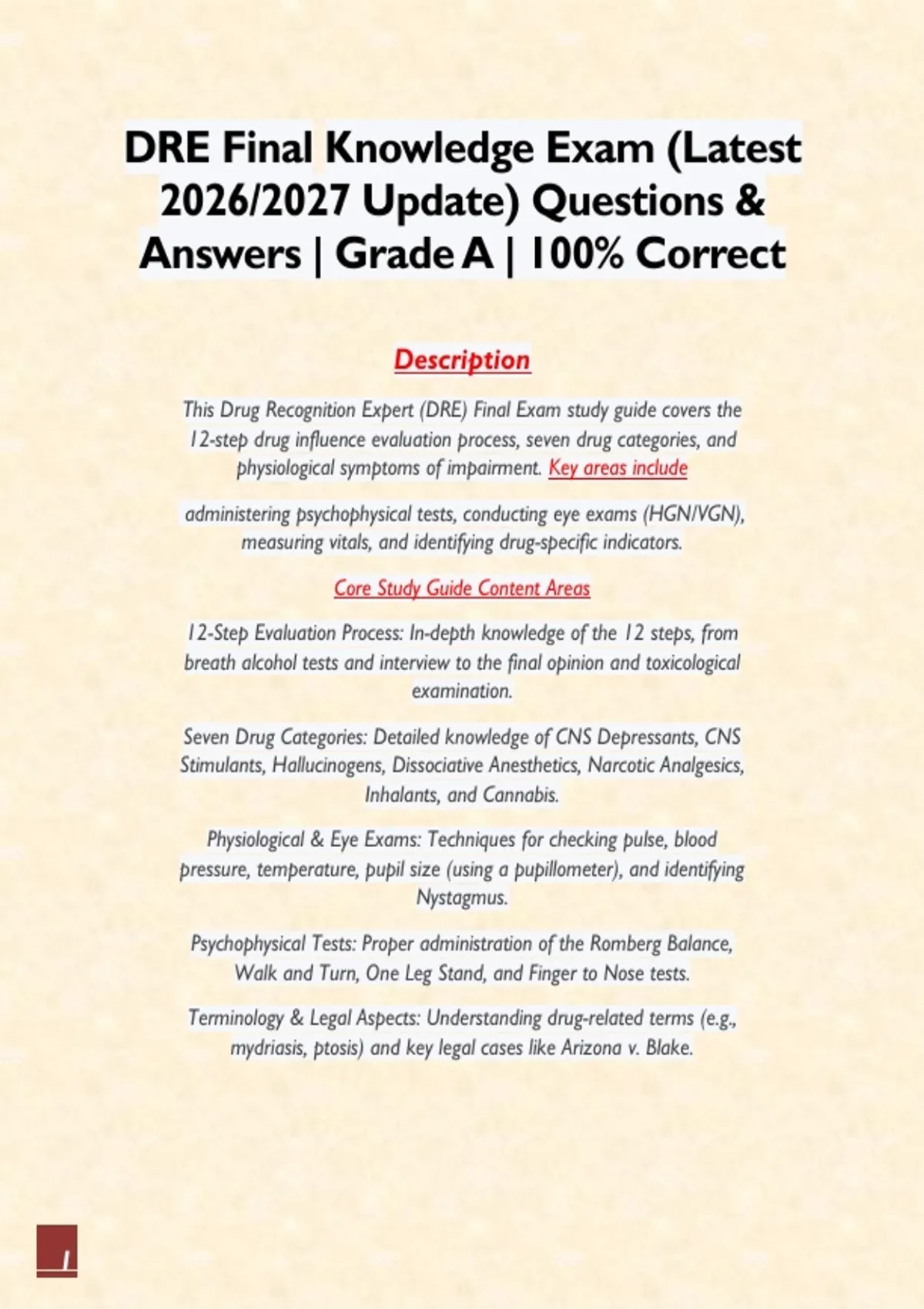 1 Exam (elaborations) DRE Final Knowledge Exam (Latest 2026/2027 Update) Questions & Answers | Grade A | 100% Correct 2 Exam (elaborations) DRE 7-Day School Final Exam (Latest 2026/2027 Update) 100 Questions & Answers | Grade A | 100% Correct Description This Drug Recognition Expert (DRE) Final Exam study guide covers the 12-step drug influence ev