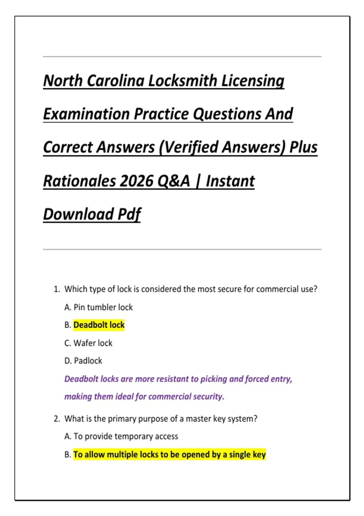 North Carolina Locksmith Licensing Examinations Practice Questions And Correct Answers (Verified Answers) Plus Rationales 2026 Q&A | Instant Download Pdf