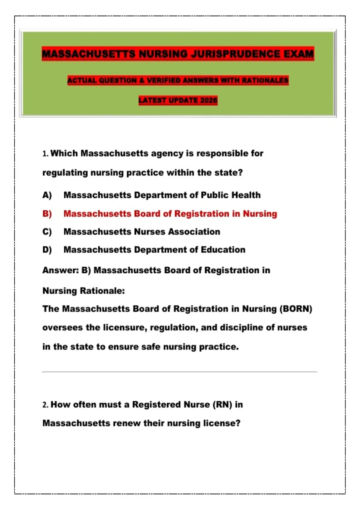BUNDLE| MASSACHUSETTS NURSING JURISPRUDENCE EXAM ACTUAL QUESTION & VERIFIED ANSWERS WITH RATIONALES LATEST UPDATE 2026