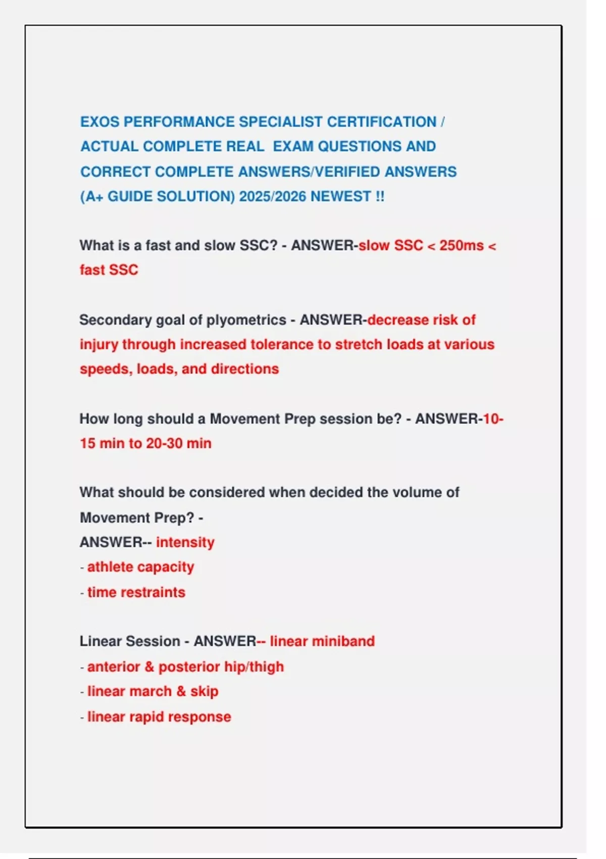 EXOS Performance Specialist Certification EXAM 2025 /2026 ACTUAL COMPLETE REAL EXAM QUESTIONS WITH ACCURATE ANSWERS (VERIFIED ANSWERS) | GET IT RIGHT!! ALREADY GRADED A+ / 2025 EXOS PERFORMANCE SPECIALIST CERTIFICATION / ACTUAL COMPLETE REAL EXAM QUESTIONS AND CORRECT COMPLETE ANSWERS/VERIFIED ANSWERS (A+ GUIDE SOLUTION) 2025/2026 NEWEST !!