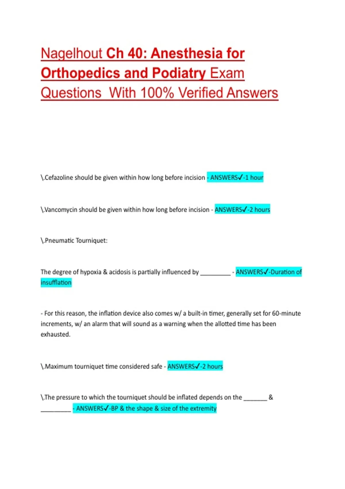 1 Exam (elaborations) Nagelhout Ch 40: Anesthesia for Orthopedics and Podiatry Exam Questions With 100% Verified Answers 2 Exam (elaborations) Nagelhout Pharmacology Ch. 10 Local Anesthetics Questions With 100% Verified Answers 3 Exam (elaborations) Nagelhout Pharmacology Exam 3 Review Questions Complete With 100% Verified Answers 4 Exam (elabor