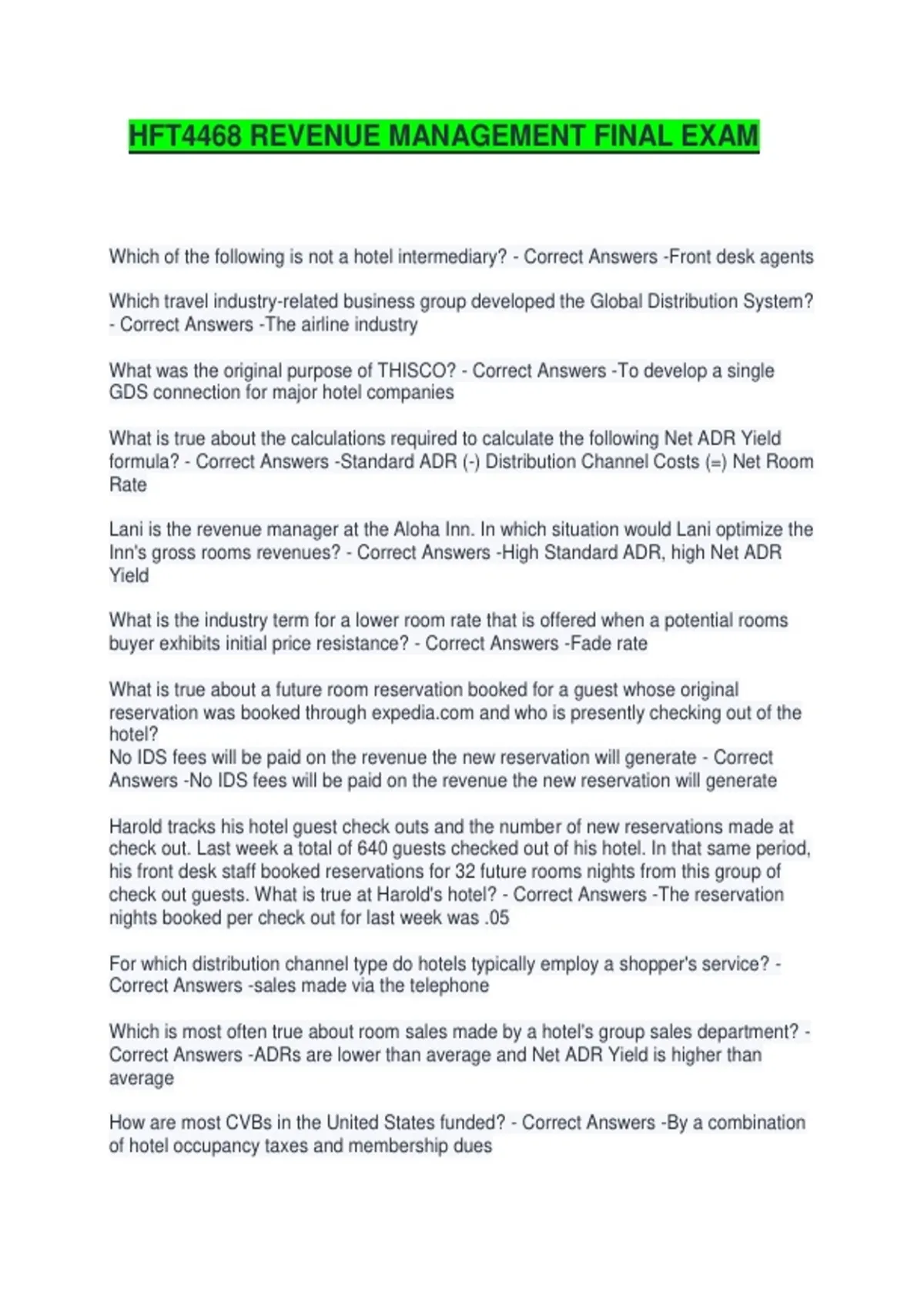HFT4468 REVENUE MANAGEMENT FINAL EXAM QUESTIONS WITH COMPLETE SOLUTIONS