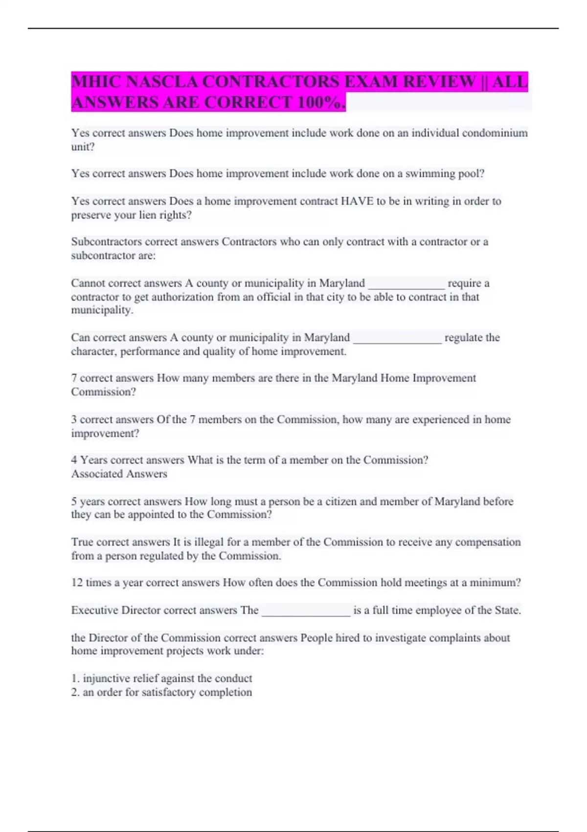 MHIC NASCLA CONTRACTORS EXAM REVIEW || ALL ANSWERS ARE CORRECT 100%. MHIC License Practice #2 || 100% Errorless Solutions. MHIC NASCLA CONTRACTORS EXAM REVIEW || WITH COMPLETE SOLUTIONS. MHIC NASCLA CONTRACTORS EXAM REVIEW || A+ GRADED. MHIC || 100% Accurate Solutions. MHIC Exam || 100% Accurate Answers.