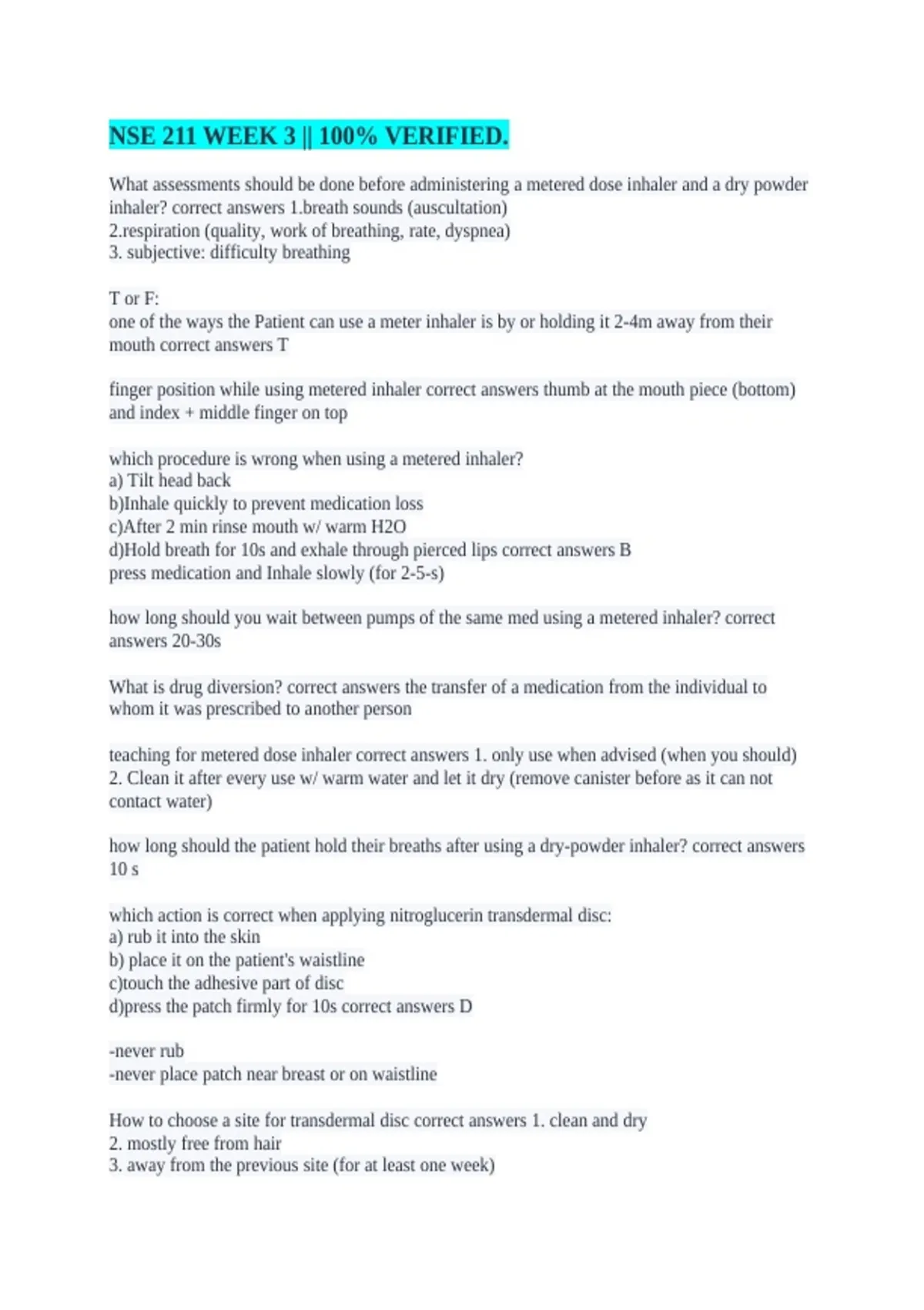 NSE 211 Week 6 - Pressure Injuries || All answered Accurately. NSE 211 WEEK 3 || 100% VERIFIED. NSE 211 Week 5 - Infection Control & Wound Care || Complete solutions NSE 211 Week 2 - Non-Parenteral Medications || with Accurate answers. NSE 211 Final Exam Review || with Complete solutions. NSE 211: Week 11 || All Accurately solved. NSE 211 Week 11 -