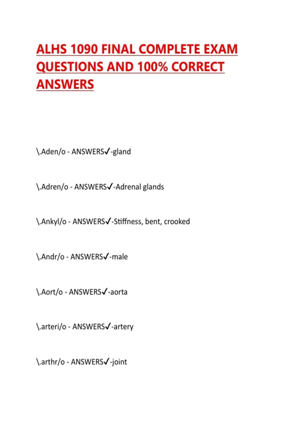 1 Exam (elaborations) ALHS 1090 FINAL COMPLETE EXAM QUESTIONS AND 100% CORRECT ANSWERS 2026 2 Exam (elaborations) ALHS 1090 FINAL EXAM QUESTIONS WITH VERIFIED ANSWERS | Endocrine, Cardiac, Blood, Respiratory Terms 3 Exam (elaborations) ALHS 1090 FINAL EXAM QUESTIONS AND VERIFIED ANSWERS | MEDICAL TERMINOLOGY 2026 4 Exam (elaborations) ALHS 1090