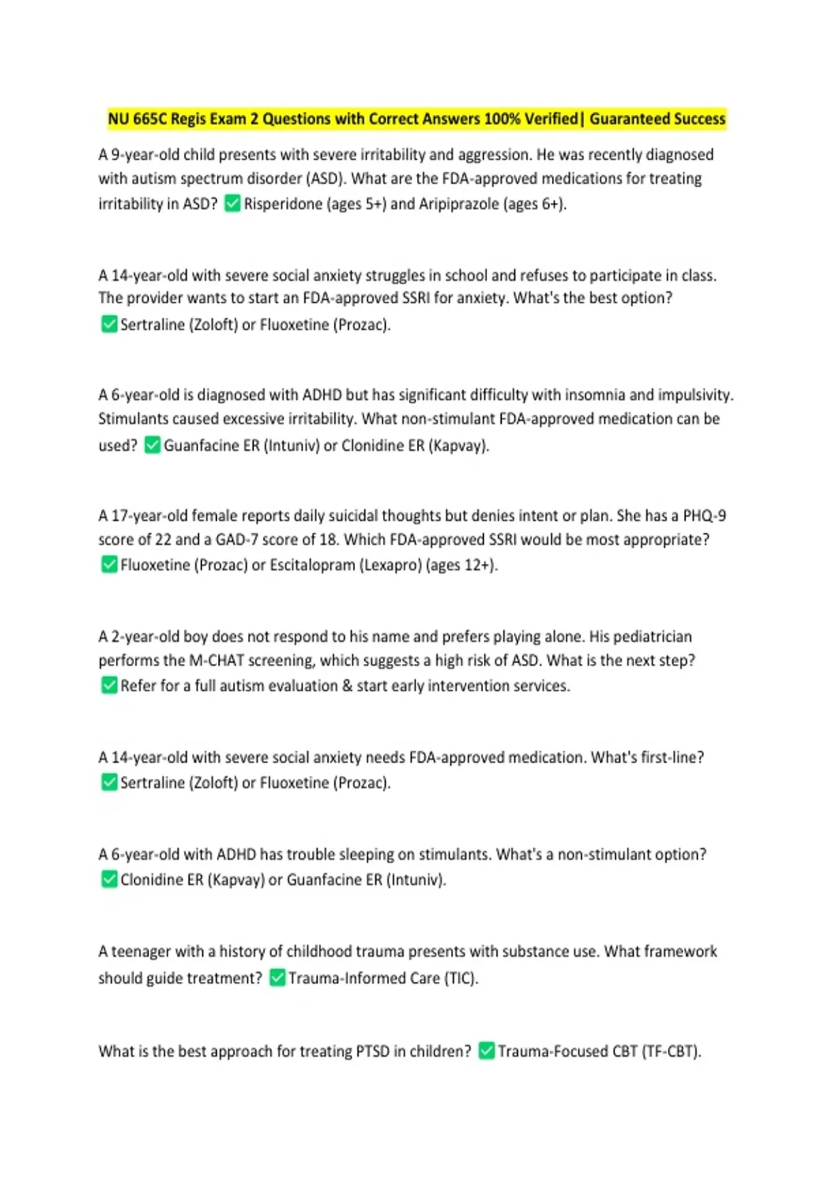 NU 665C Regis Exam 2 Questions with Correct Answers 100% Verified 2 Exam (elaborations) NU 665C Regis Exam 2 Questions with Correct Answers 100% Verified 3 Exam (elaborations) NU 665C Week 8 study guide for Exam 2 Questions with Correct Answers 100% Verified