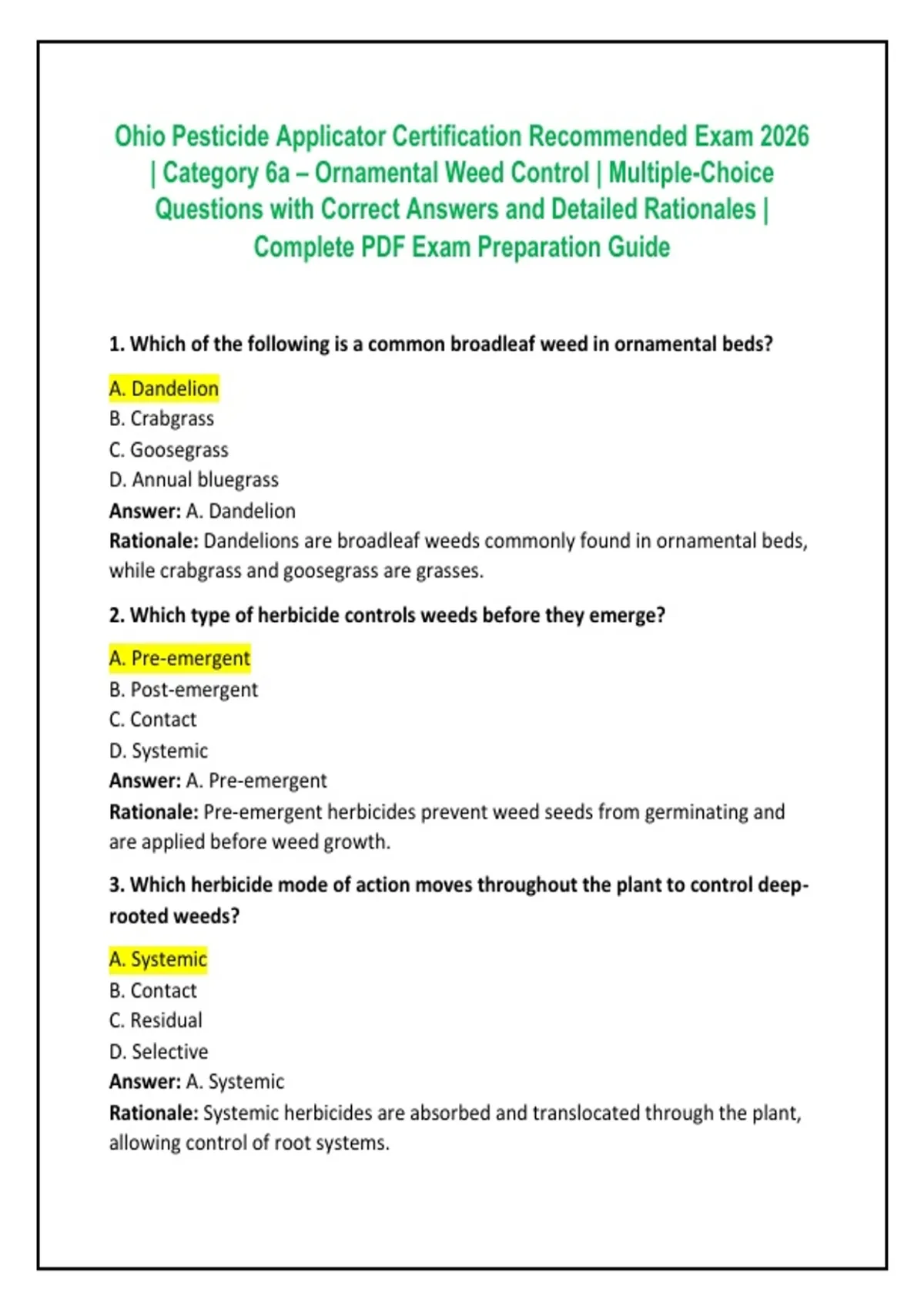Ohio Pesticide Applicator Certification Recommended Exam 2026 | Category 6a – Ornamental Weed Control | Multiple-Choice Questions with Correct Answers and Detailed Rationales | Complete PDF Exam Preparation Guide