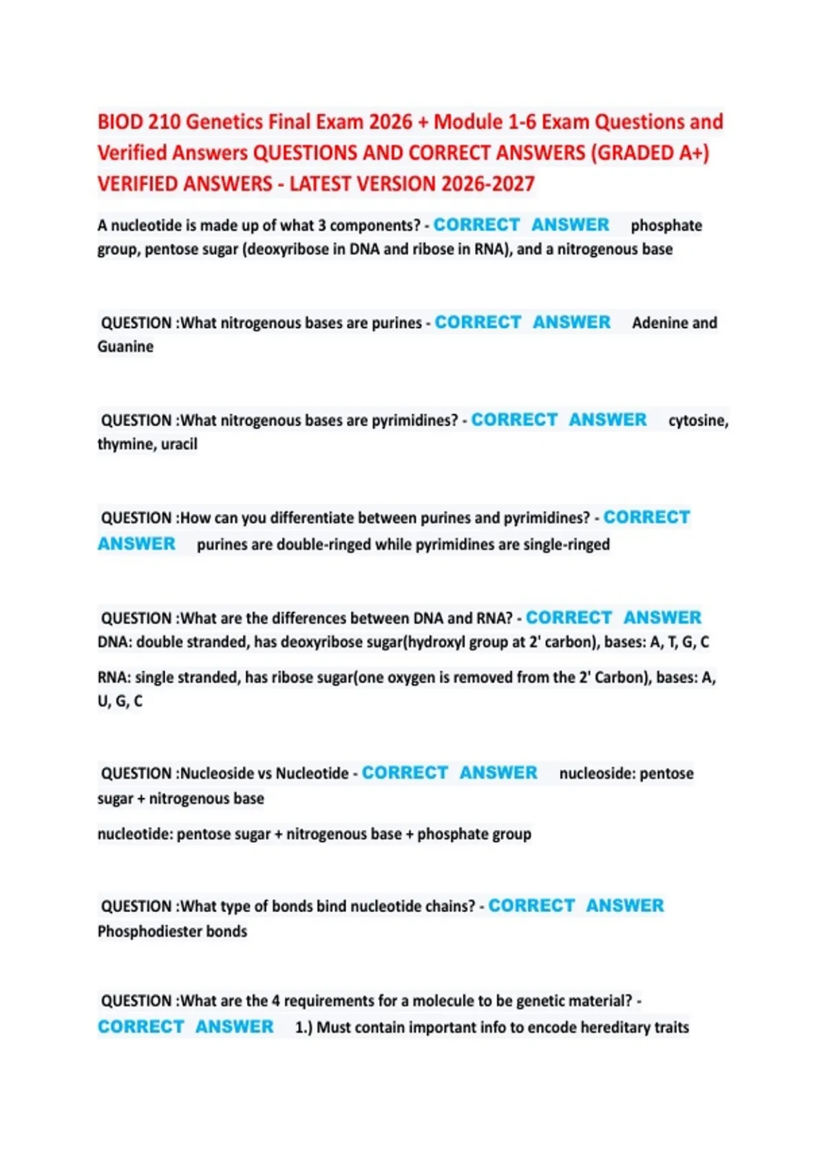 1 Exam (elaborations) BIOD 210: Genetics | Module 1 Practice Exam | Questions & Correct Answers Graded A+ | Verified Answers | Latest Version 2 Exam (elaborations) BIOD 210: Genetics | Module 2 Practice Exam | Questions & Correct Answers Graded A+ | Verified Answers | Latest Version 3 Exam (elaborations) BIOD 210: Genetics | M