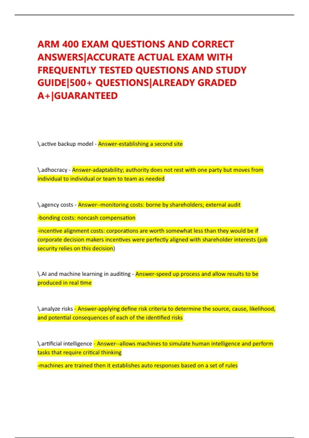 Exam (elaborations) ARM 400 EXAM QUESTIONS AND CORRECT ANSWERS|ACCURATE ACTUAL EXAM WITH FREQUENTLY TESTED QUESTIONS AND STUDY GUIDE|500+ QUESTIONS|ALREADY GRADED A+|GUARANTEED 2 Exam (elaborations) ARM 400: Section A, Assignment 2 - Risk Management Today Test Bank Questions With Verified Answers | Verified Exam Questions 3 Exam (elaborations) AR