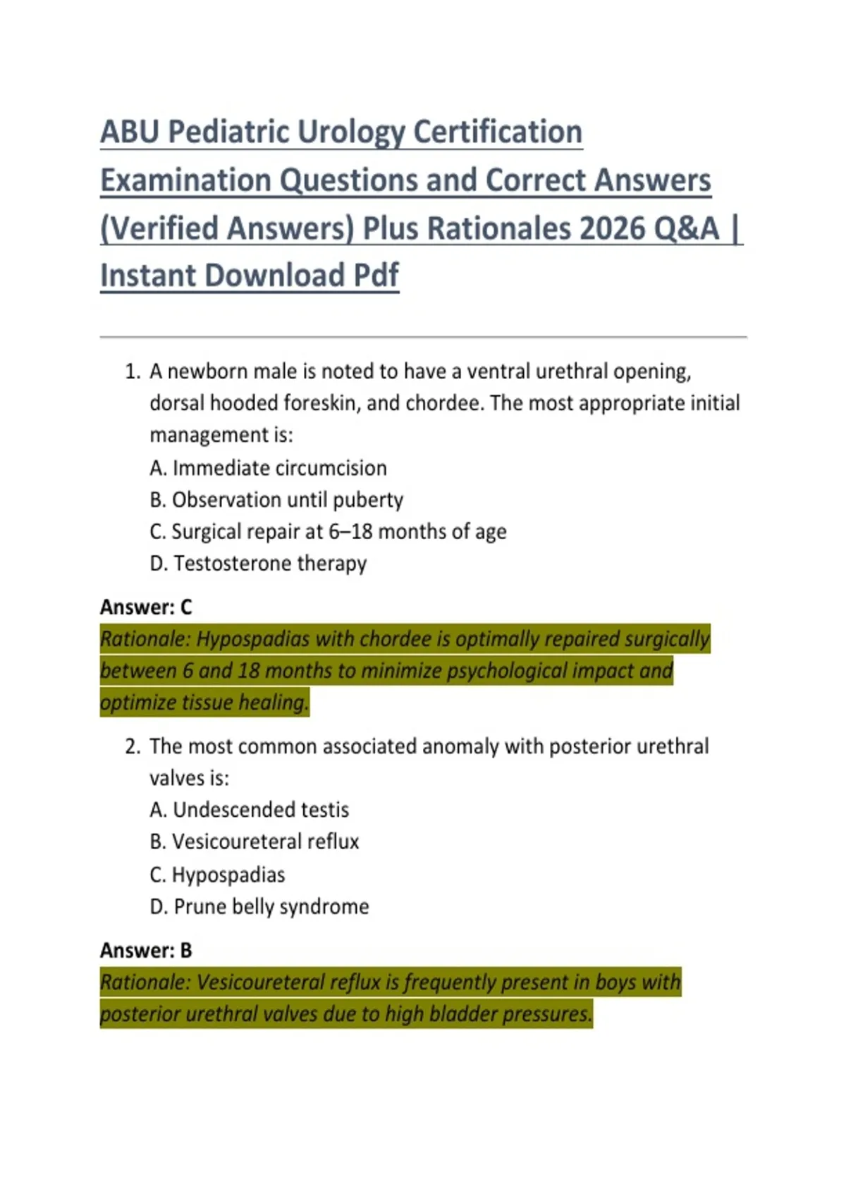 Bundle for ABU Pediatric Urology Certification Examination Questions and Correct Answers (Verified Answers) Plus Rationales 2026 Q&A | Instant Download Pdf