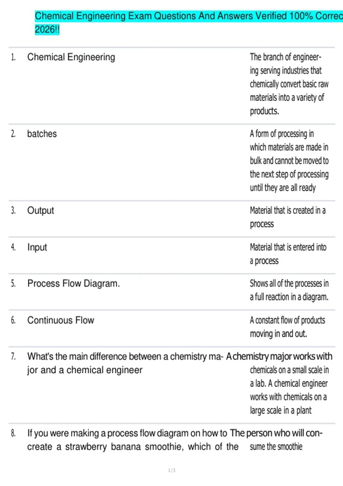 Chemical Engineering Principles Solved Correctly To Score A+ Chemical Engineering Test Questions With Complete Solutions chemical engineering exam questions with all correct answers latest update!!!