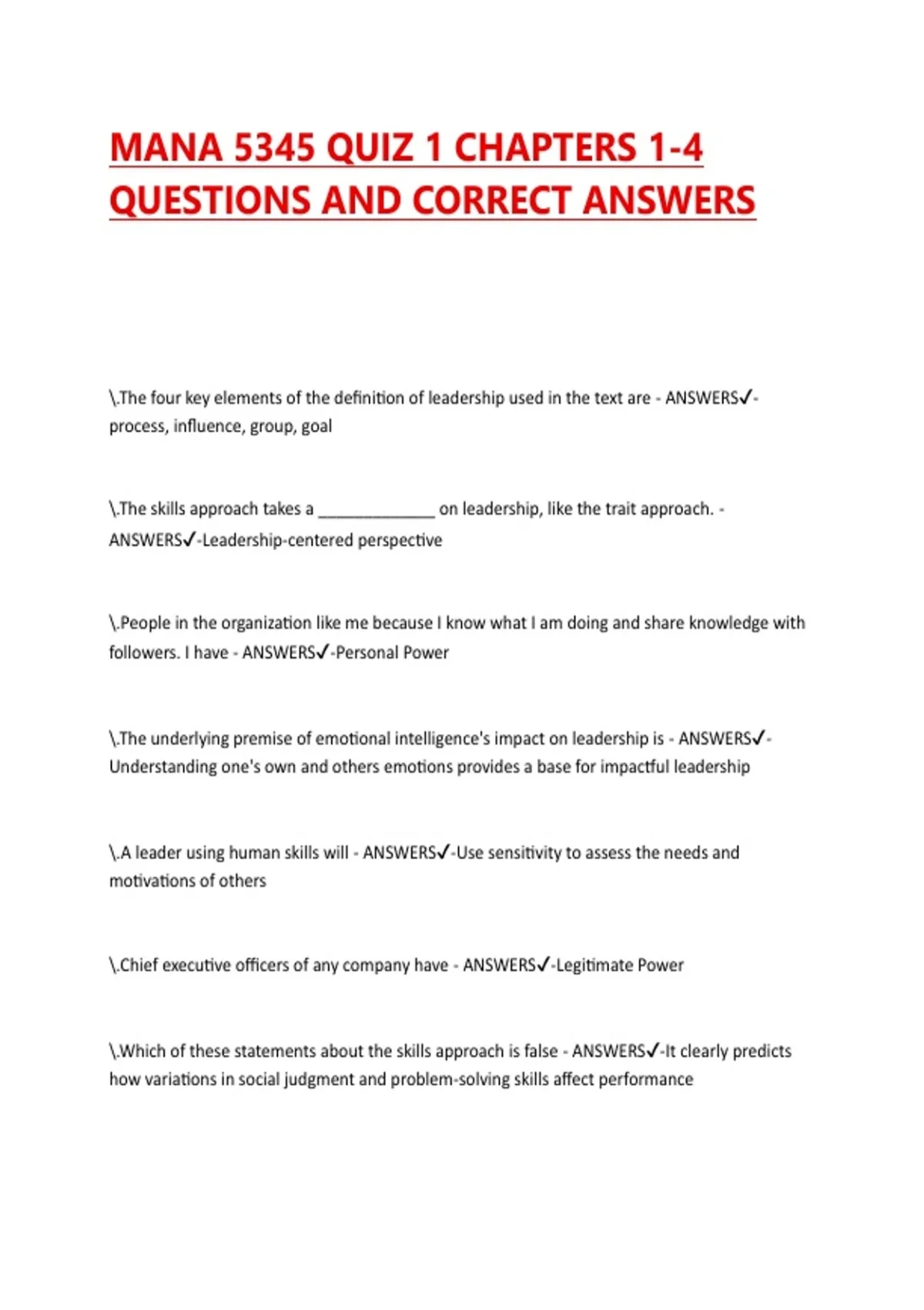 1 Exam (elaborations) MANA 5345 QUIZ 1 CHAPTERS 1-4 QUESTIONS AND CORRECT ANSWERS 2 Exam (elaborations) MANA 5345 - EXAM 1- CHAPTER 7 (LEADERSHIP: THEORY AND PRACTICE) 101 COMPLETE QUESTIONS AND 100% CORRECT ANSWERS 3 Exam (elaborations) MANA 5345 - EXAM 1- CHAPTER 3 COMPLETE 100 QUESTIONS AND 100% OUTLINED ANSWERS 4 Exam (elaborations) MANA 534
