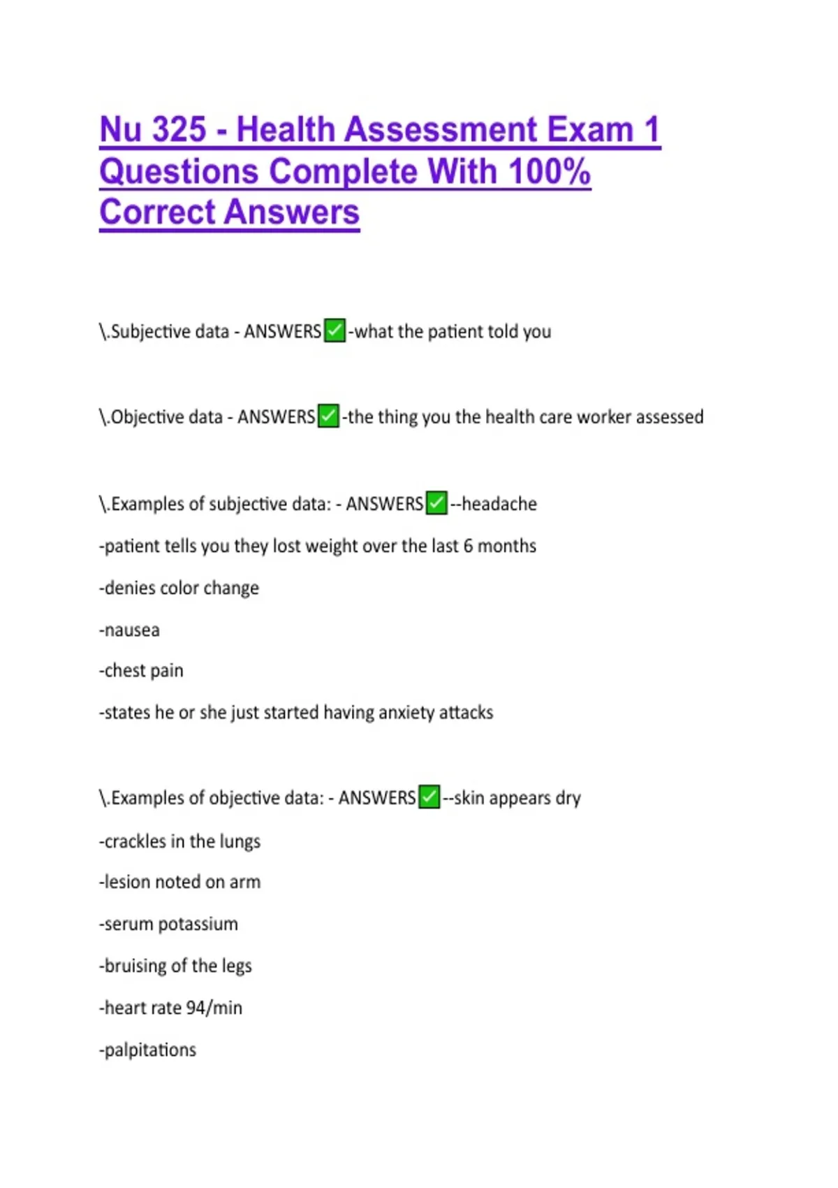 1 Exam (elaborations) NU 325 EXAM 1 (CH 1,2,3,4,8) COMPLETE QUESTIONS WITH 100% VERIFIED ANSWERS 2 Exam (elaborations) Nu 325 - Health Assessment Exam 1 Questions Complete With 100% Correct Answers 3 Exam (elaborations) NU 325 EXAM 2 QUESTIONS WITH 100% VERIFIED ANSWERS 4 Exam (elaborations) NU 325 EXAM 2 COMPLETE 169 QUESTIONS WITH 100% VERIFIE
