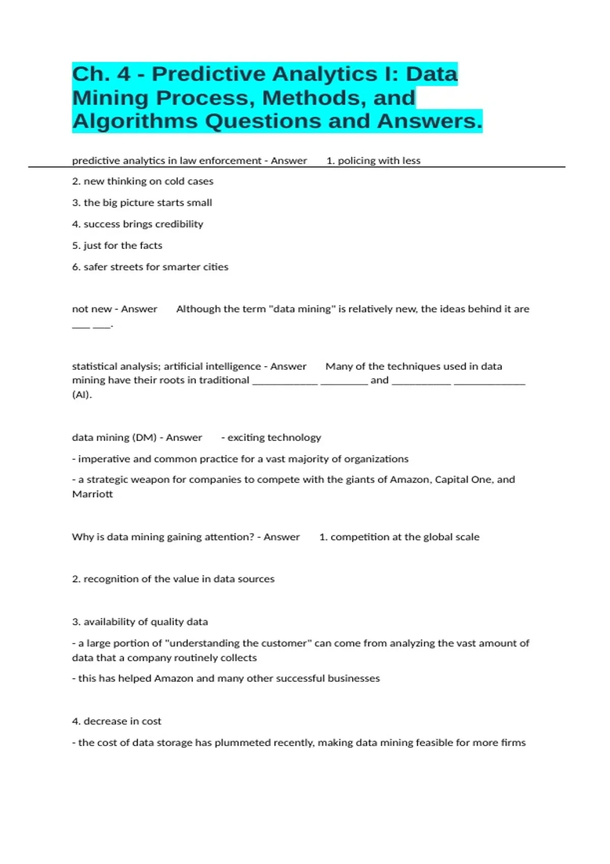 1 Exam (elaborations) Predictive Analytics Ch. 8 And Chap 9 Test Questions and Correct Answers. 2 Exam (elaborations) MIS372 - Predictive Analytics Questions and Answers. 3 Exam (elaborations) MIS 373 PRED ANALYTCS & DATA MINING QUESTIONS AND ANSWERS.