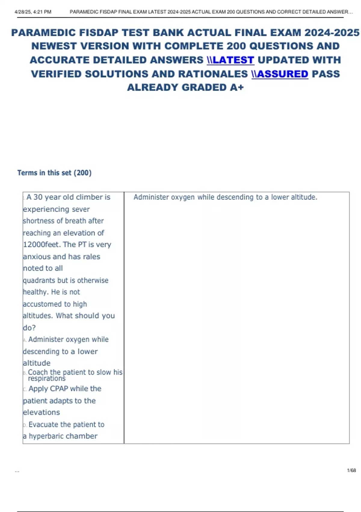 PARAMEDIC FISDAP TEST BANK ACTUAL FINAL EXAM 2026 NEWEST VERSION WITH COMPLETE QUESTIONS AND ACCURATE DETAILED ANSWERS LATEST UPDATED WITH VERIFIED SOLUTIONS AND RATIONALES ASSURED PASS ALREADY GRADED A+ PARAMEDIC FISDAP TEST BANK ACTUAL FINAL EXAM 2026 NEWEST VERSION WITH COMPLETE QUESTIONS AND ACCURATE DETAILED ANSWERS LATEST UPDATED WITH VERI
