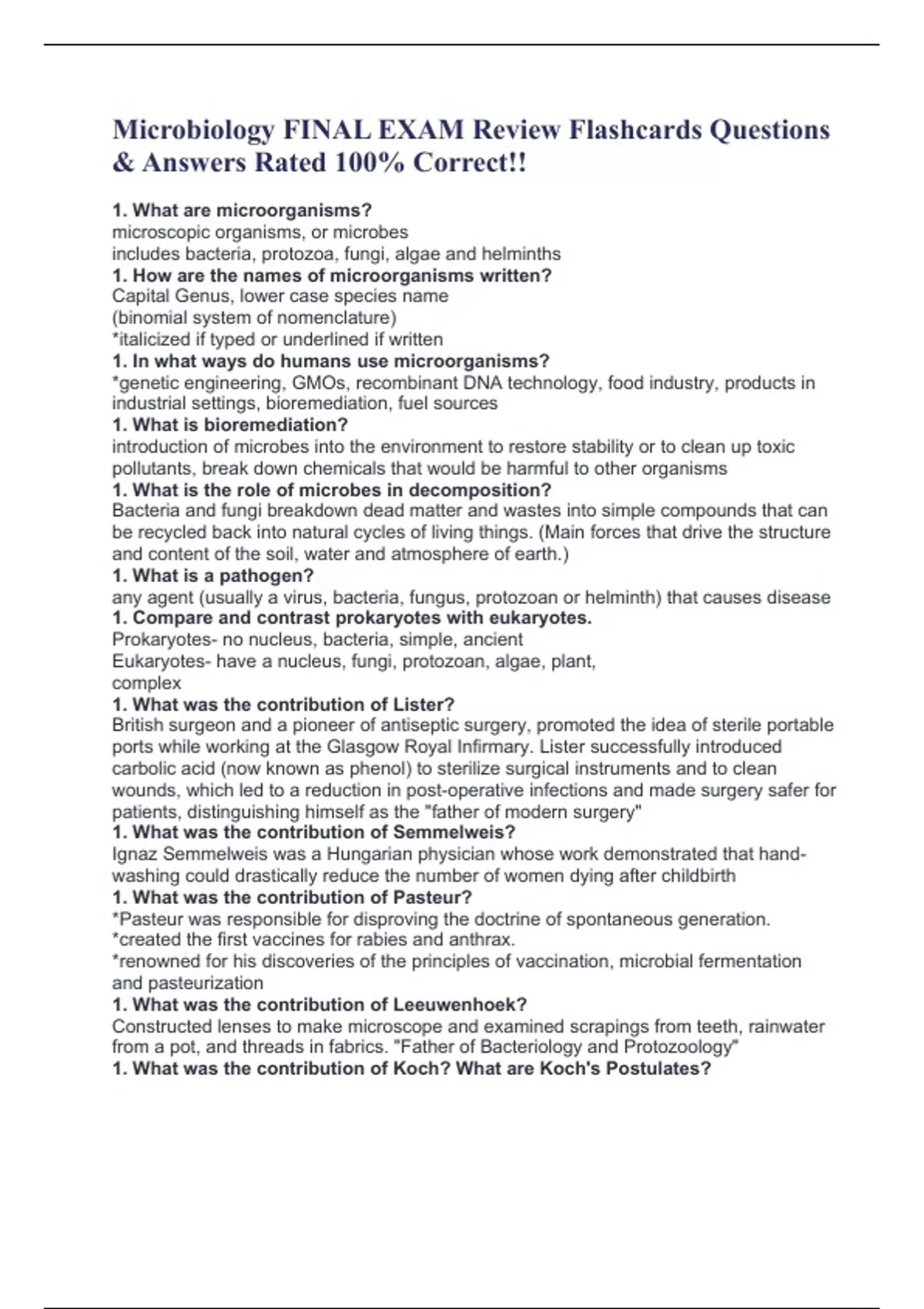 Exam (elaborations) History of Microbiology- Exam #1 |Immunology, Pathogen Dynamics, Microbial Genetics, Prokaryotic & Eukaryotic Cell Structure, Biofilms, Antibiotics, Viral and Acellular Agents, Binomial Nomenclature, Koch’s Postulates, Germ Theory, Epidemiology, Public He 2 Exam (elaborations) Biology II Exam #2 |Plant & Animal Biology Exam: V