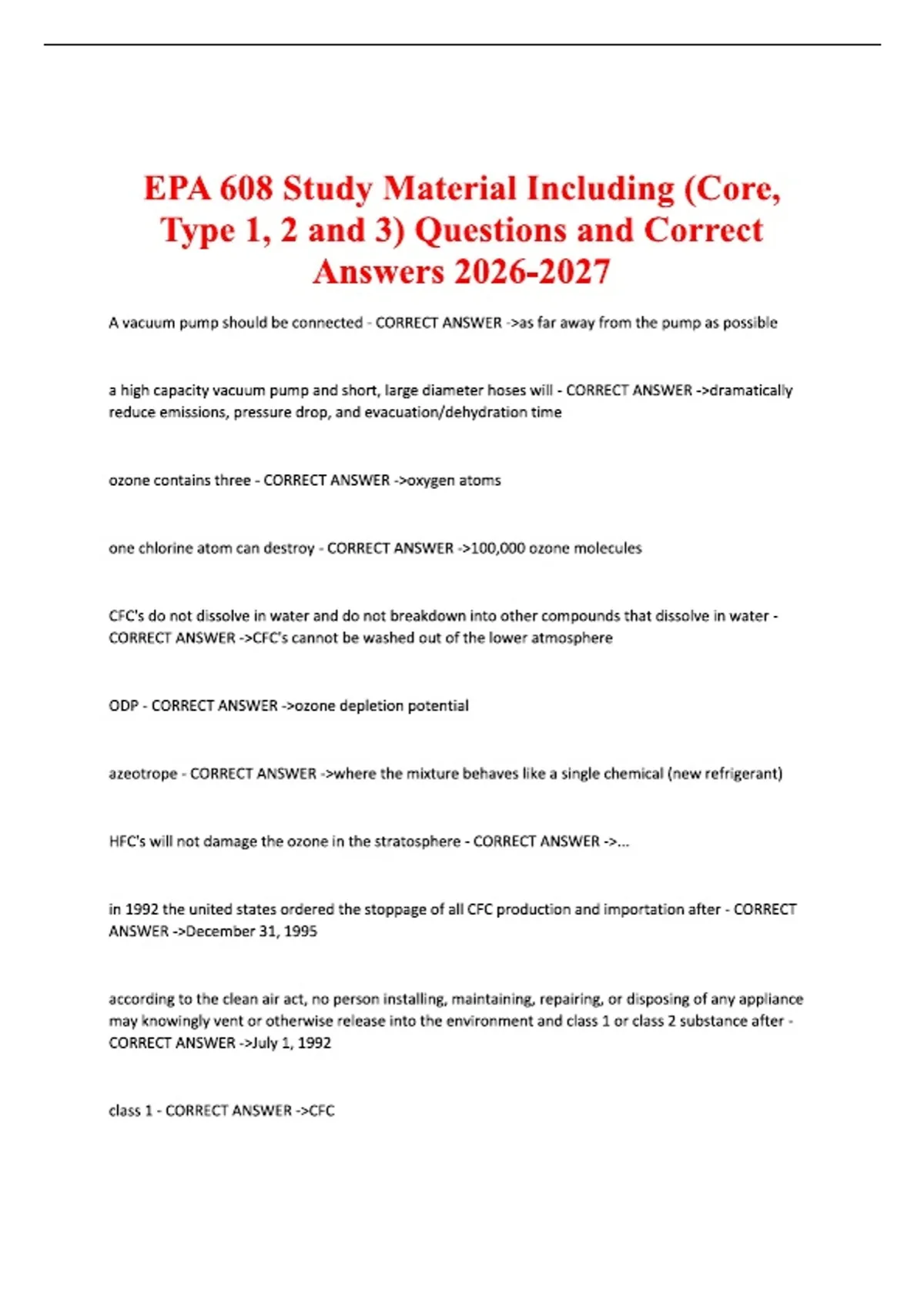 EPA 608 Study Material Including (Core, Type 1, 2 and 3) Questions and Correct Answers