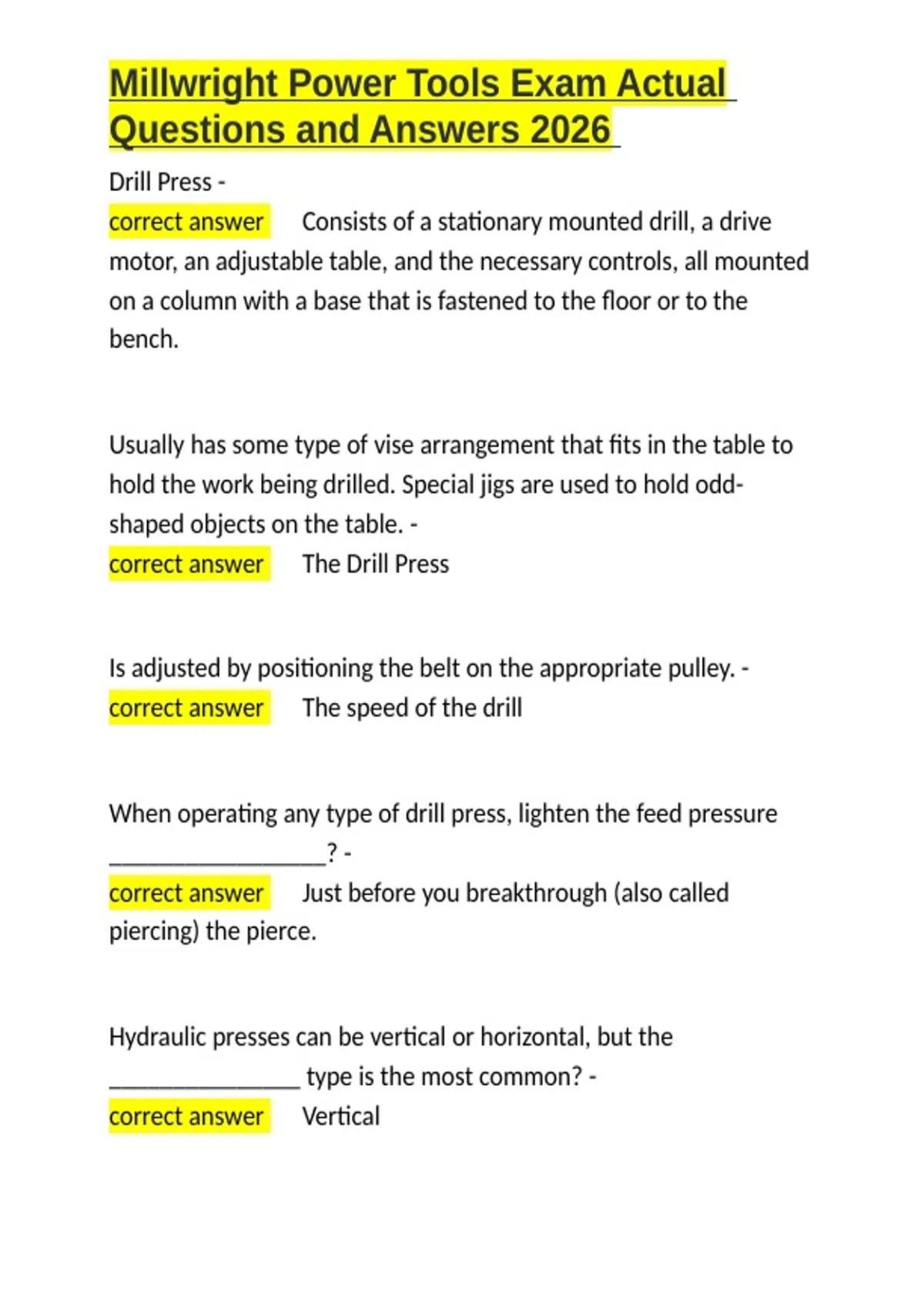 Millwright Power Tools Exam Actual Questions and Answers 2026.docx