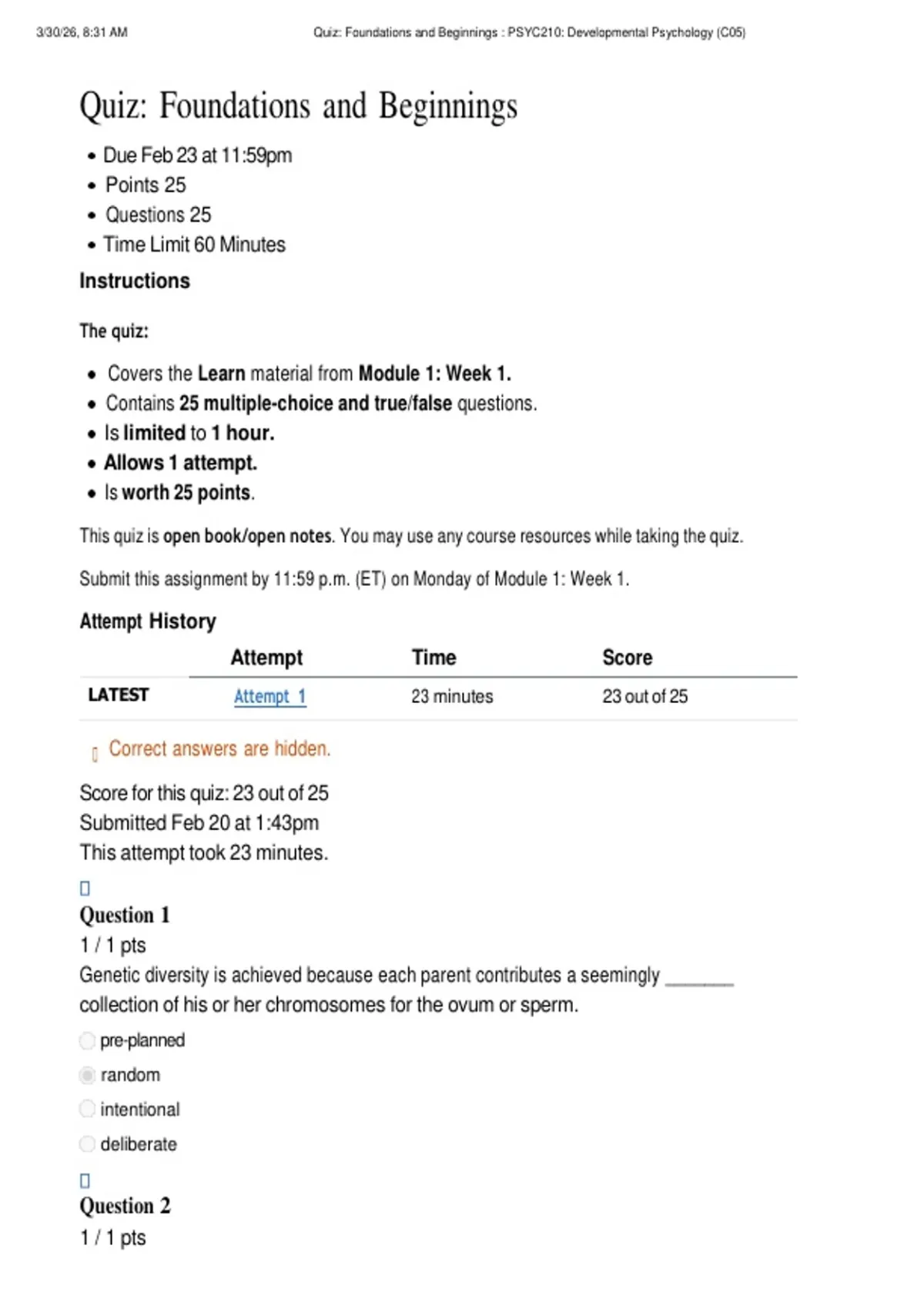 PSYC 210 Quiz: Foundations and Beginnings | Score 23/25 | Liberty University