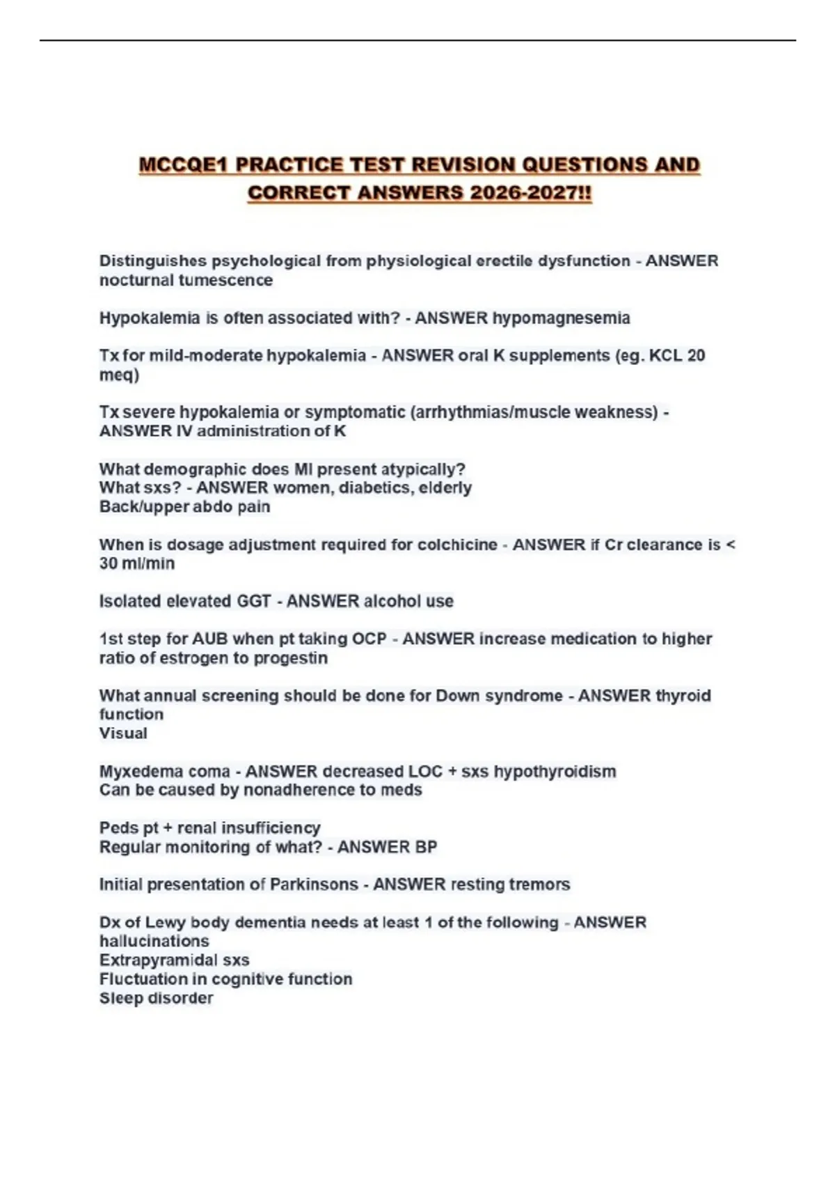 MCCQE1 EXAM STUDY SET TEST QUESTIONS AND CORRECT ANSWERS 100% VERIFIED LATEST UPDATE!!