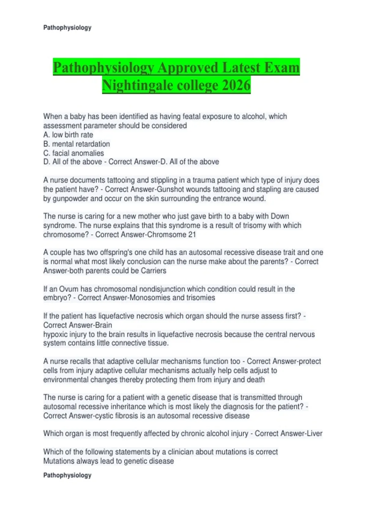 Pathophysiology Best latest Updated Nightingale College Exam 2026 due April Pathophysiology Final Detailed Exam Questions and Verified Solutions 2026 Pathophysiology Midterm Complete Exam 2026 Nightingale College
