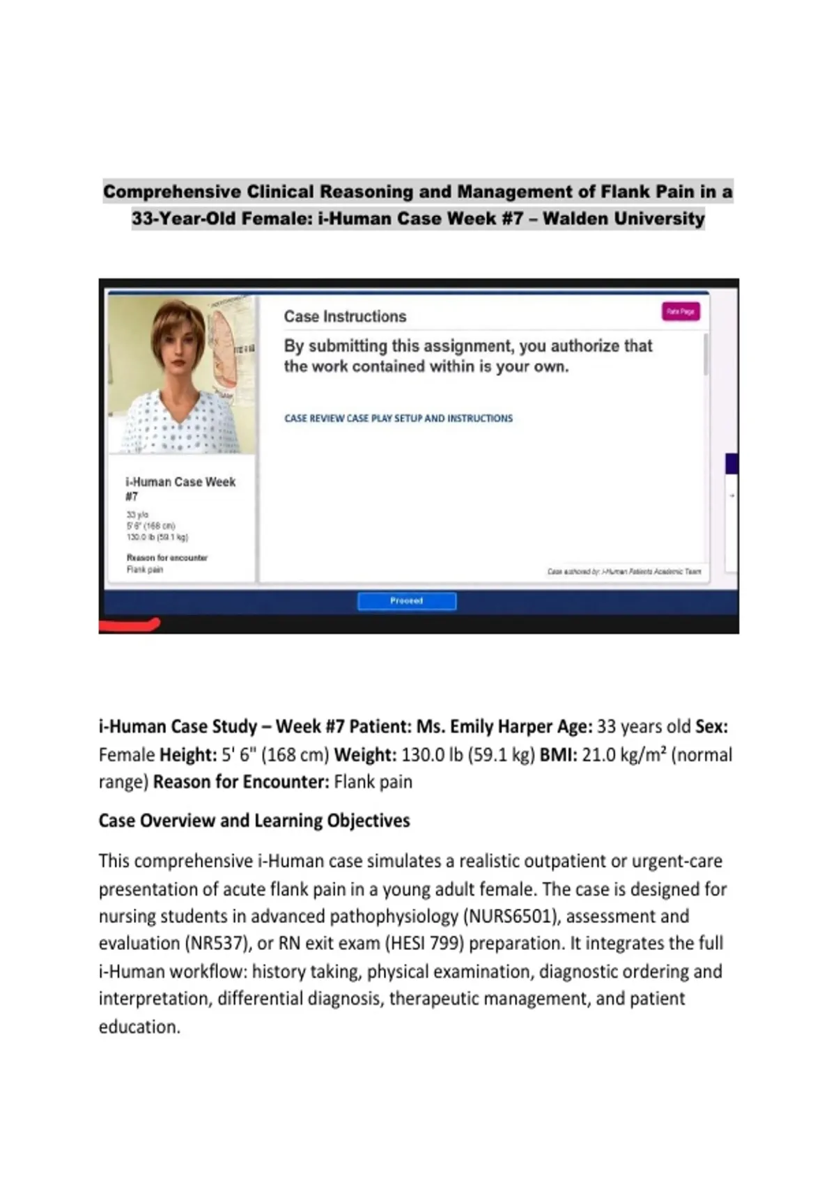 This comprehensive i-Human Week 7 bundle provides a complete diagnostic breakdown for a 33-year-old female presenting with acute right-sided flank pain. It includes a fully structured SOAP note, a detailed history of present illness, and an expert-led analysis of differential diagnoses such as pyelonephritis and nephrolithiasis. Designed for nursin