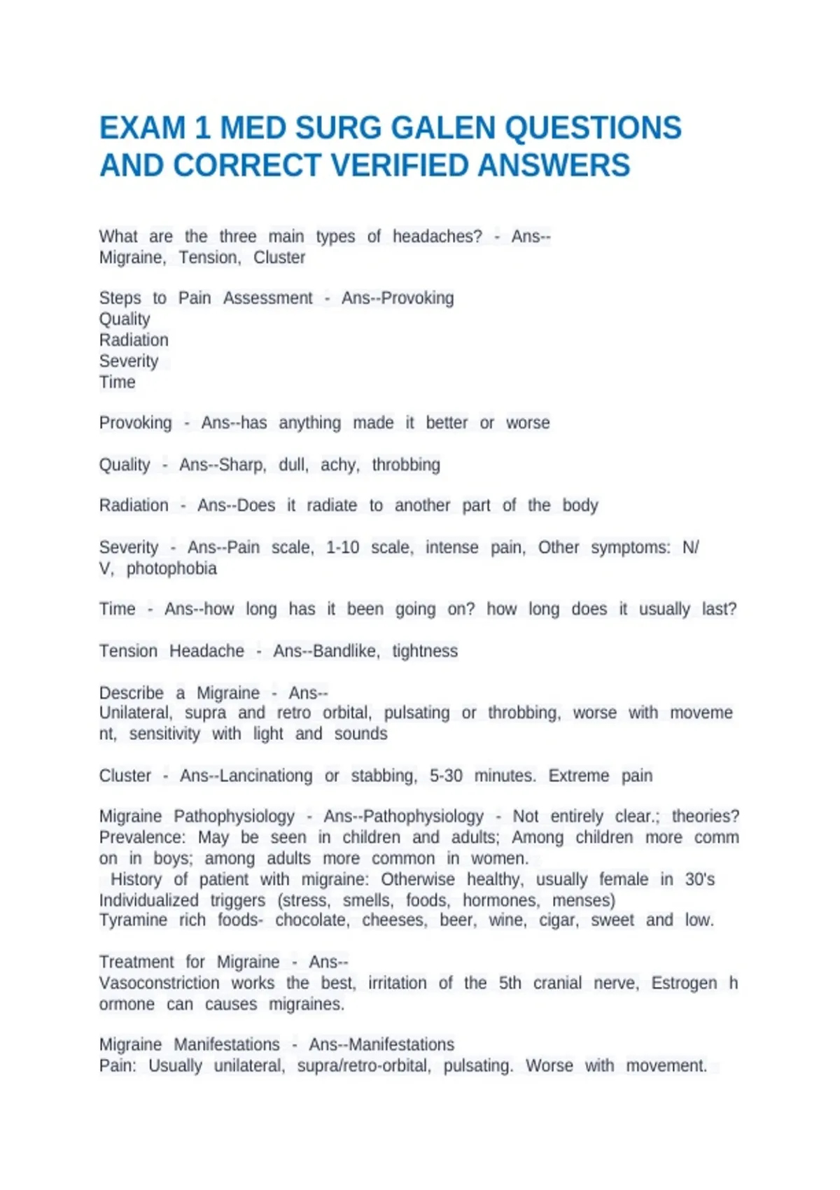 AM - GALEN 170 EXAM 1 (PERIOPERATIVE, COMFORT, ANEMIA) 20-30 (FLUID & ELECTROLYTES, ACID BASE) 20-30 QUESTIONS AND CORRECT VERIFIED ANSWERS